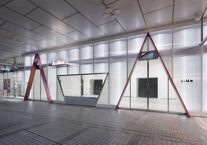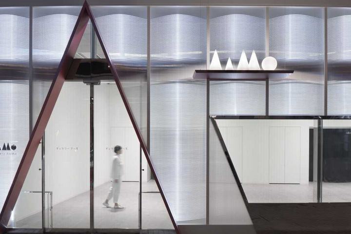 Logo标志采用了我们用“AAMO”这四个字的抽象三角形和圆形,像积木似的轮廓,给人以既怀旧又现代的印象。门前,我们利用光线的折射,随着视角与距离的变化,呈现出不可思议的光线墙壁。另外,Logo标志的立体化发光材料、把客人引入画廊的三角形门庭,都充满童趣。(川崎敏弘/WALTZ.)