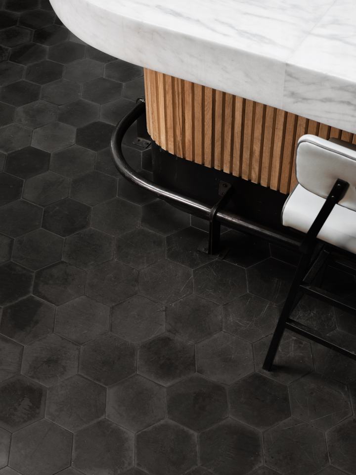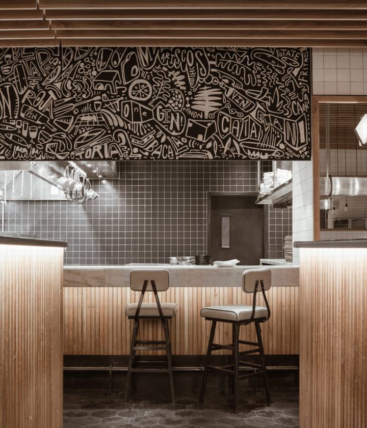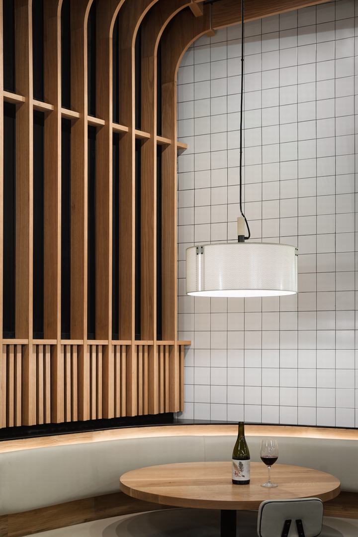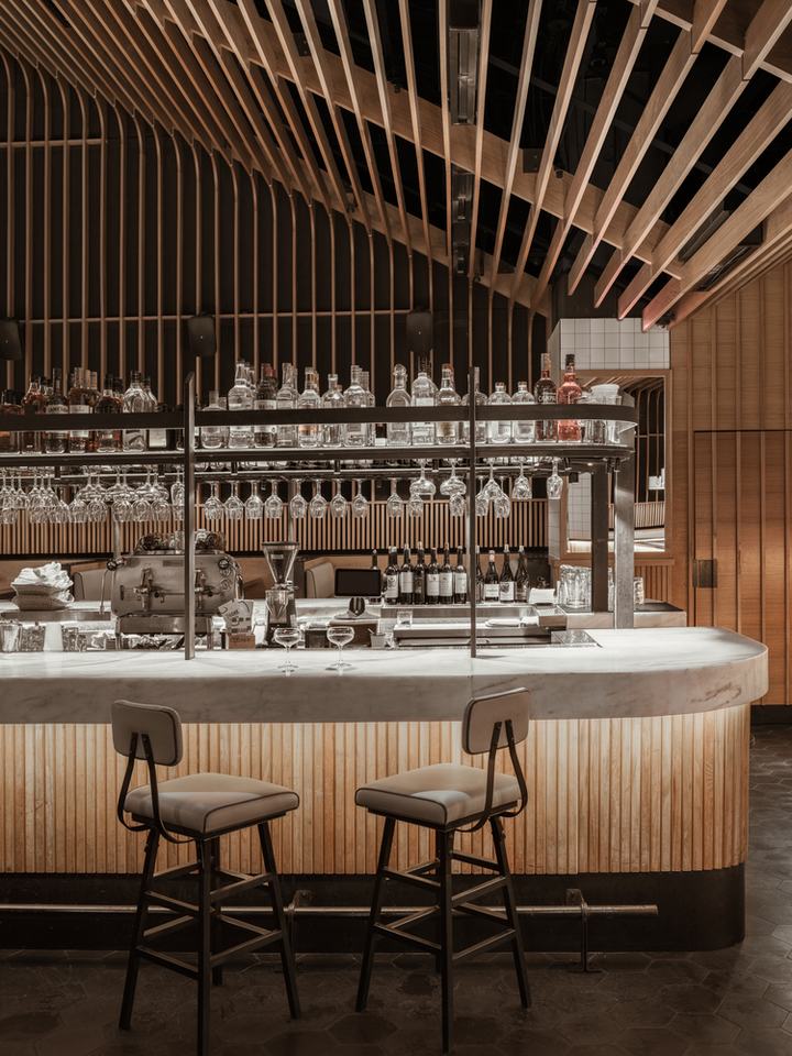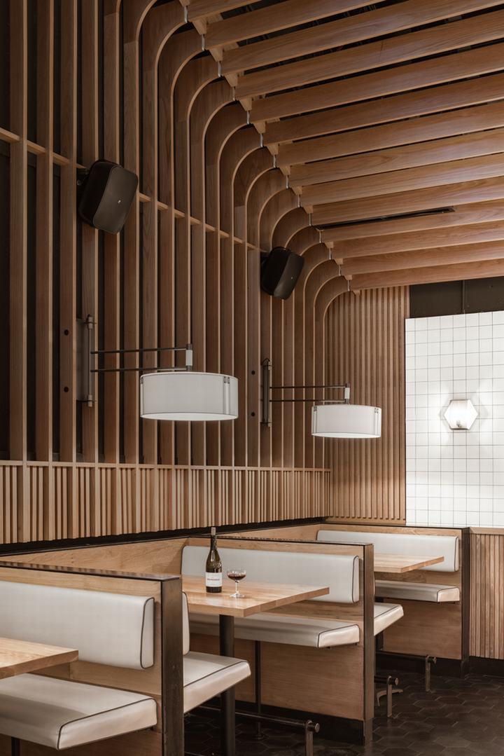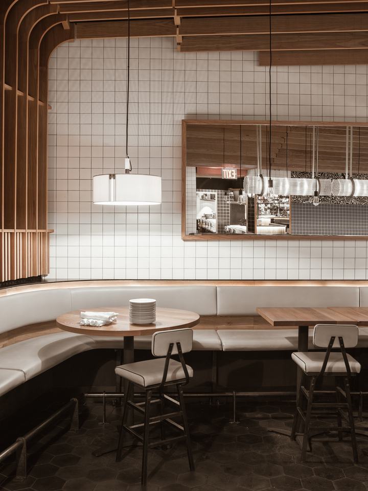 材料选择仅限于木材,大理石台面,黑化钢和黑色水泥地砖。定制设计的灯具通过划定座位区域和桌子进一步增强了体验。注重细节极大地有助于创造一个具有合适比例的空间,无论天花板(有些在22′处)和连接墙与天花板的高度对于提供整体柔软度的正确感知至关重要。