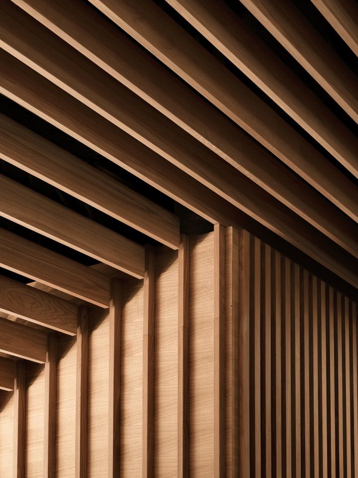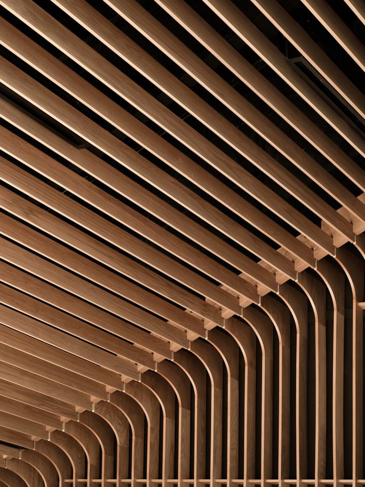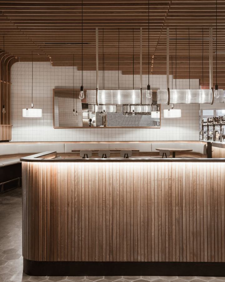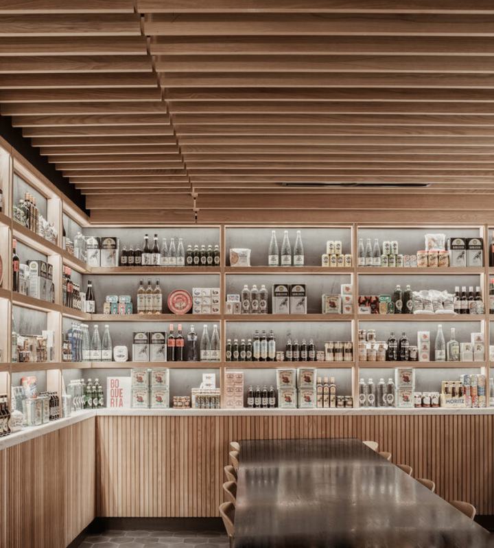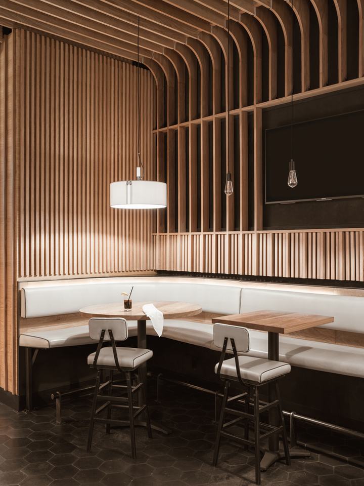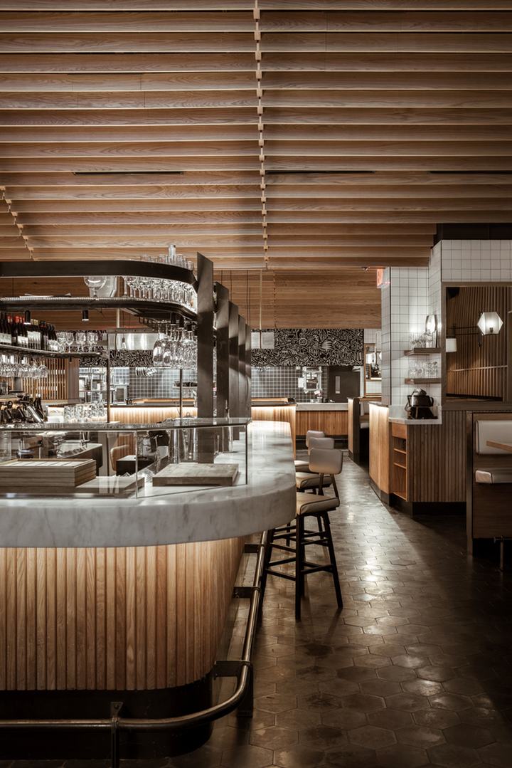 餐厅概念源自着名的巴塞罗那市场,位于一个巨大的屋顶结构之下,激发了我们创造一个无所不包的氛围,与市场并无二致。仅使用木材,我们的设计意图是减少不断变化的天花板高度(有些超过20′),其中一个不同的表面由木板条组成。然后它们会向下弯曲以沿着墙壁延伸以产生温暖的质地,当它向下延伸时会逐渐消失。