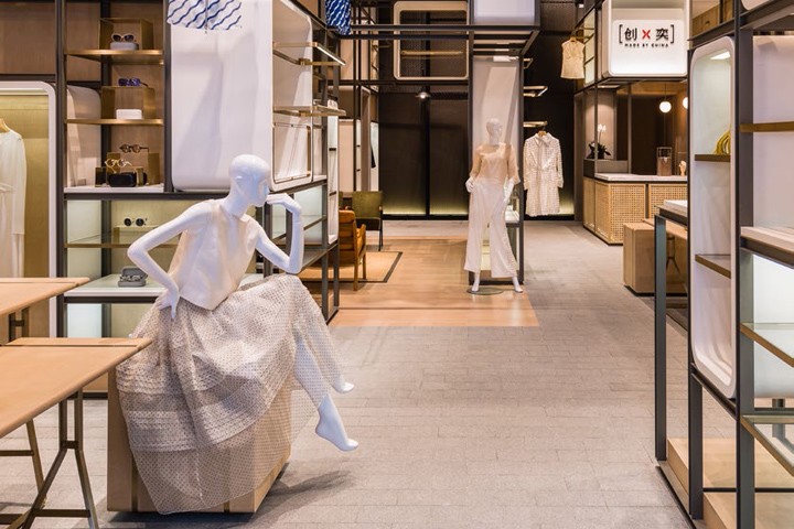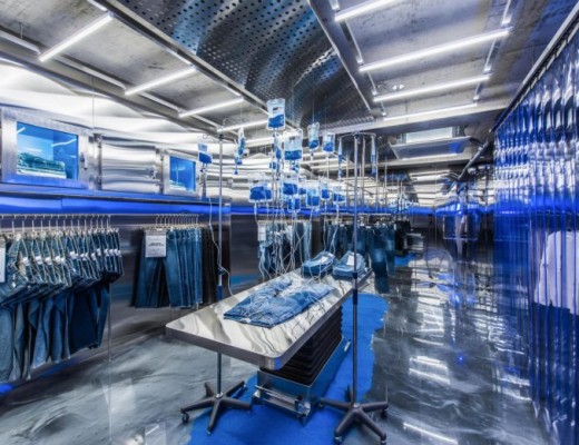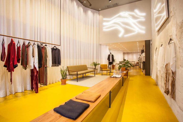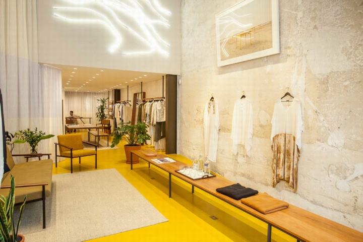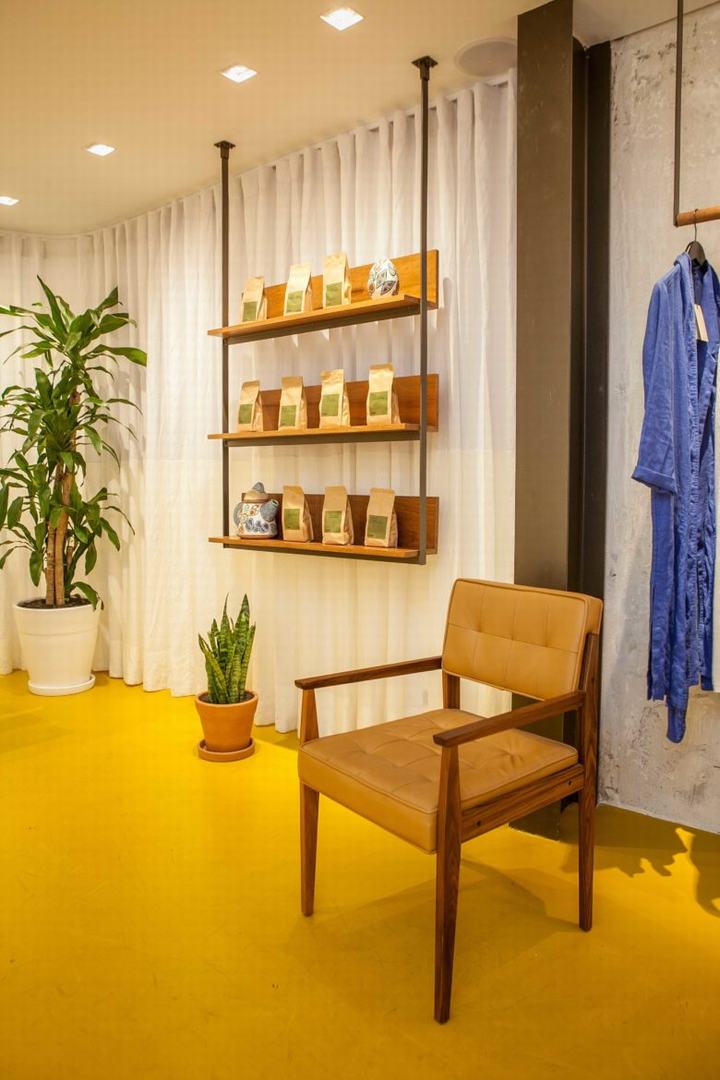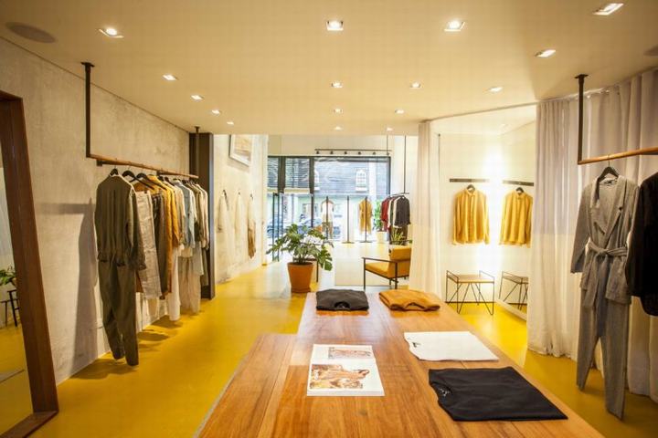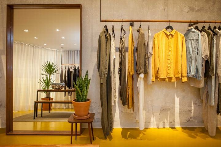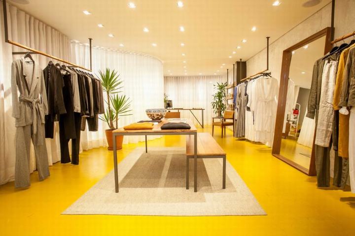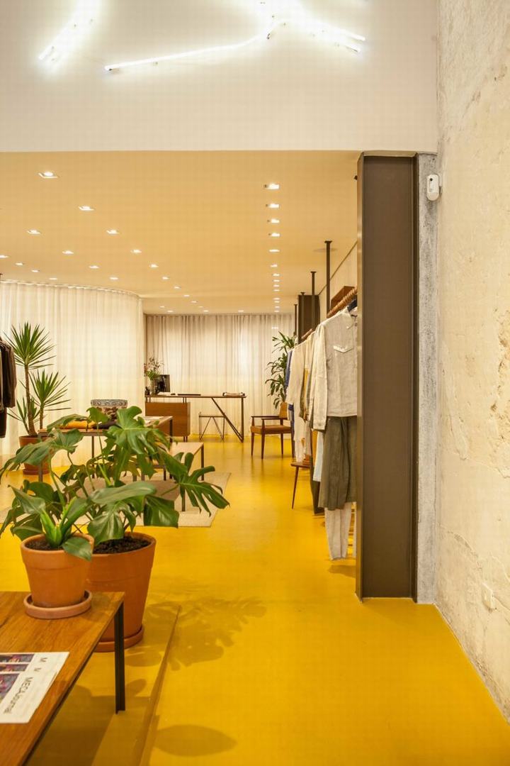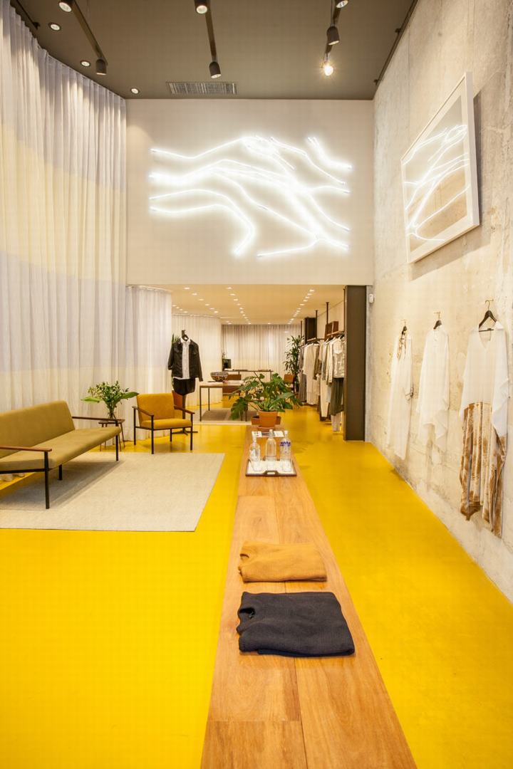 这个空间全部由起伏的亚麻窗帘包围,为更衣室创造空间,同时在三个环境中流畅地分布:一个双层入口级客厅,天花板上悬挂着金刚鹦鹉,入口坡道上有一个长长的展台;展览环境,桌子,长凳和衣帽架;并在底部,在收银台展出各种产品。用于窗帘的亚麻布是该品牌最知名的原材料,采用两种略微不同的白色调,以提供更舒适的比例,同时参考造型师经营的面料成分。芥末色的单片环氧树脂地板,木材和深色钢板细节,突出商店入口的剥落墙,现代主义设计,霓虹灯艺术家Kleber Mateus唤起里约热内卢的海滩和分布的热带植物盆在空间利用材料的自然特质,营造温暖舒适的环境,如品牌的亚麻服装。