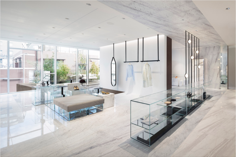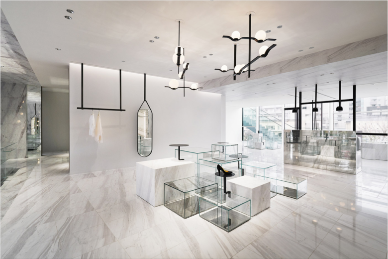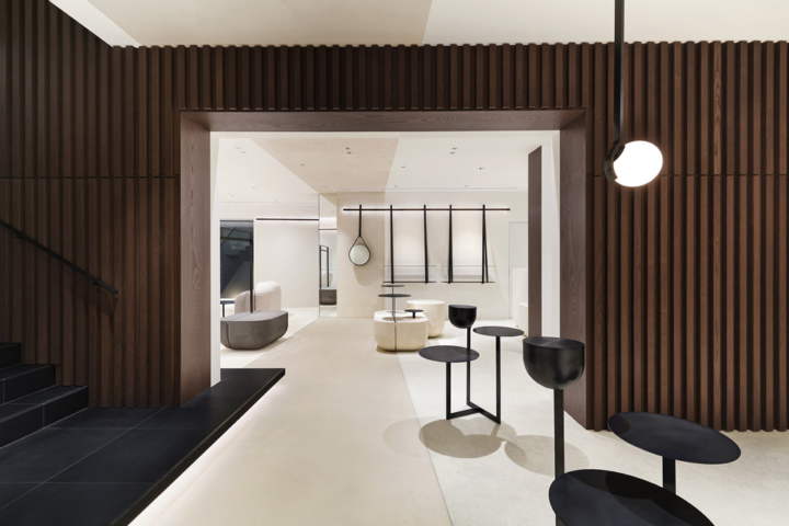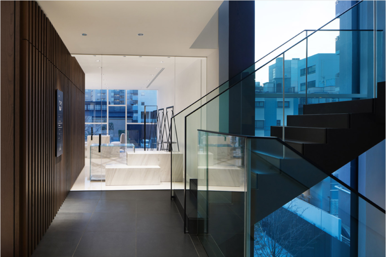 地下室空间使用两种不同类型的砾石,而两者的混合物用于覆盖它们所覆盖的盒子之间的重叠部分的地板。一楼铺有人字形水磨石地板,二楼铺有织物纹理水泥。在三楼,大理石印有石材纹理,玻璃相反印有大理石图案。第四层和第五层的地板由石头和木材组合而成,以重复的图案设计,也用于覆盖同一空间的墙壁的石砖.Kashiyama Daikanyama商店