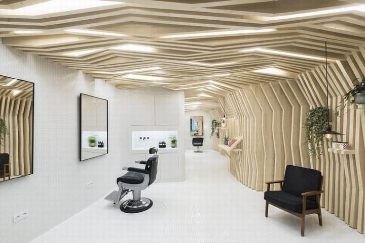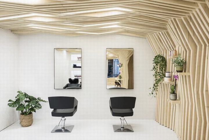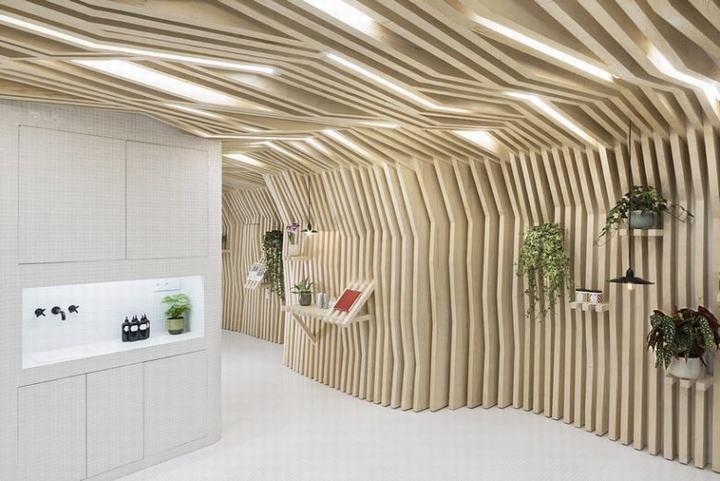 沙龙设有木墙装置,分支到天花板,为游客提供了一个遮阳篷。该装置由松木制成,由238个雕刻的薄片组成,提醒游客森林中的树木。墙壁元素包括展示产品或植物的小架子,增加了自然的气氛。照明集成在天花板分支之间,营造出舒缓的照明,模仿光线穿透树叶。