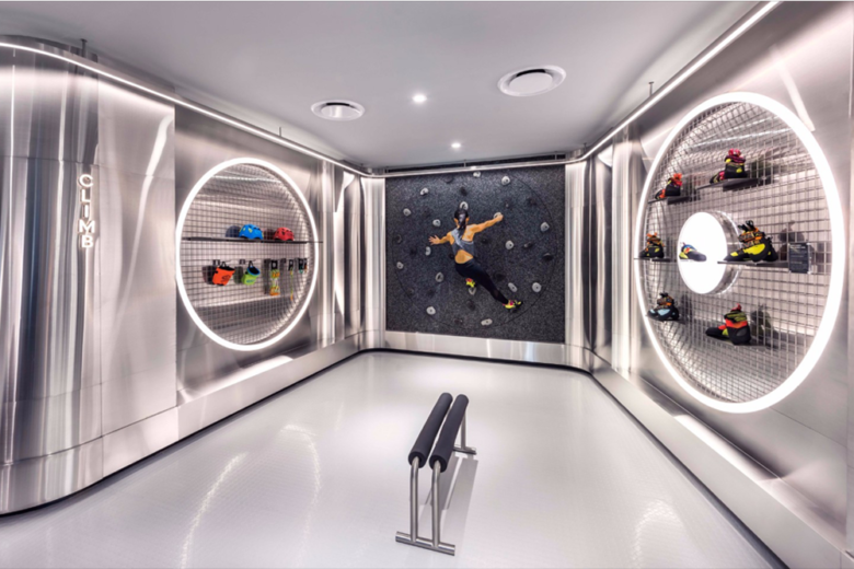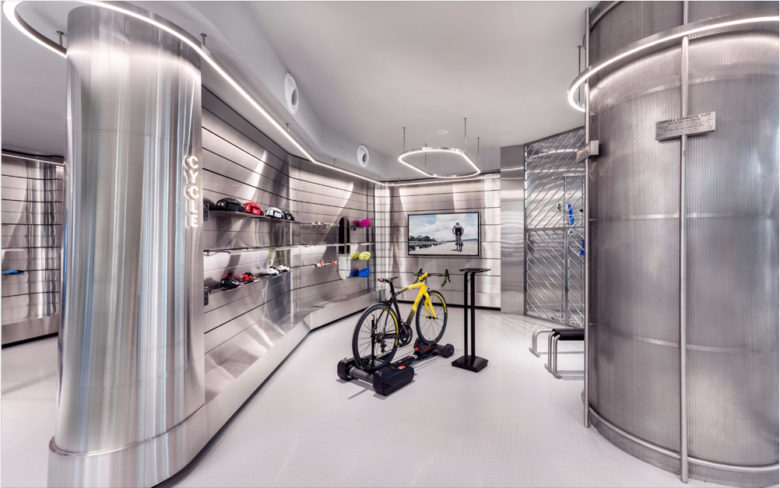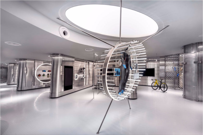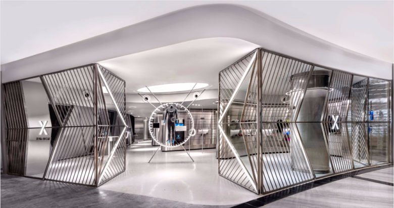 在280个零售和招待场所中,有一个是体育用品商店Durasport。由建筑实践部设计,未来派的设置旨在吸引体育爱好者,并看到设备和墙壁面板的光泽不锈钢。一种灵活的显示系统,由架子和支架组成,可以夹在或夹在有缺口的显示墙上。店面由一个钢架和一个指向中央入口的人字形图案组成,传达出一种运动的感觉。在任何实验开始时,x符号都被用来表示催化剂,让人联想到两个箭头聚集在一起,就像商店入口处的x。