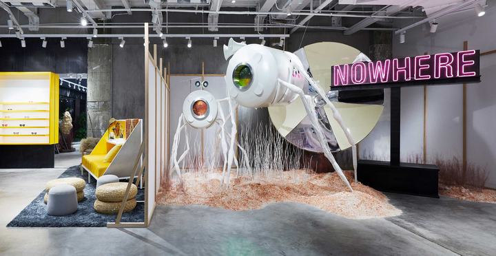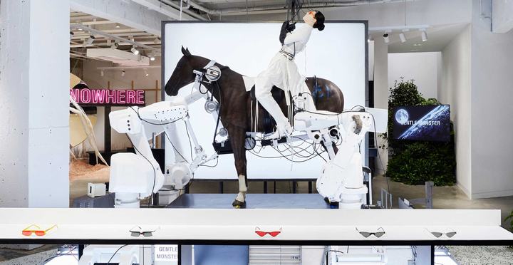 Gentlemonster店的空间内容,是目前我认为做的最棒的一个,如淮海路这家店,空间内容的索引是这样的:以“THE MOBITECTURE”为主题,讲述了人类在未来世界中制作移动空间,寻找栖息地的故事。以此为索引,在空间中做了大量的内容,这些内容让消费者体验到不一样的精神世界,每个艺术装置都是一个故事。