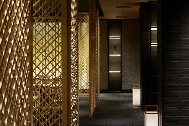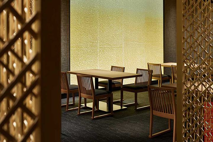 支柱用瓦样素材,墙面采用特殊的布料,同时又从“雨景”为最有风情的风景的角度,将灯墙设置为使人联想到雨景模样的传统“和纸“。它是一种无法用尺子测量的空间的表达。其中“间”的概念是东洋独有的表达,以“和魂洋才(日本明治维新时期的一个思想。顾名思义,“和魂”指大和民族的精神,“洋才”是指西洋的科技。)”为概念,融合了现代材料与东洋传统文化。使历史悠久的野鹤亭的品格与现代化的表现融合展现在一个时间轴上。(袴田广基/ACCA)