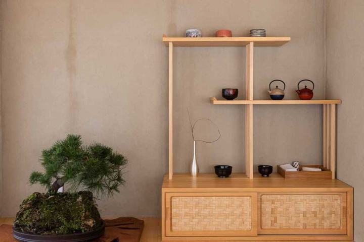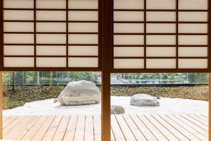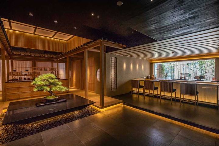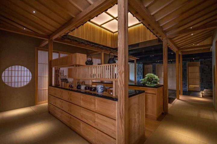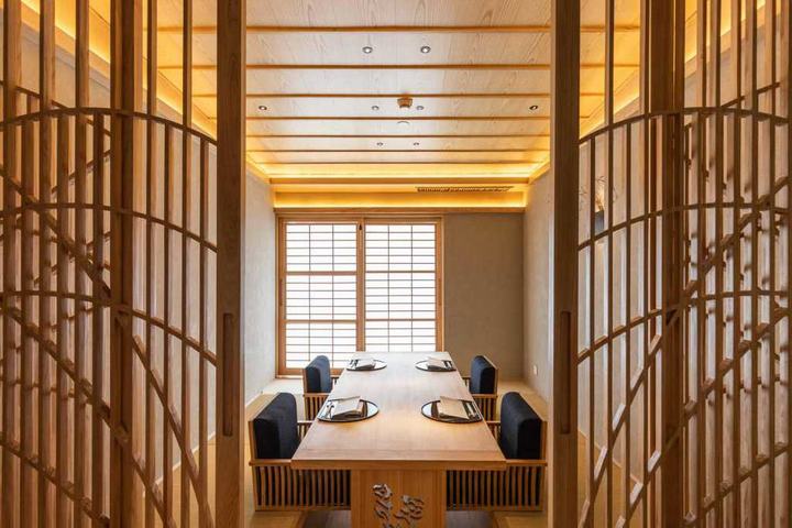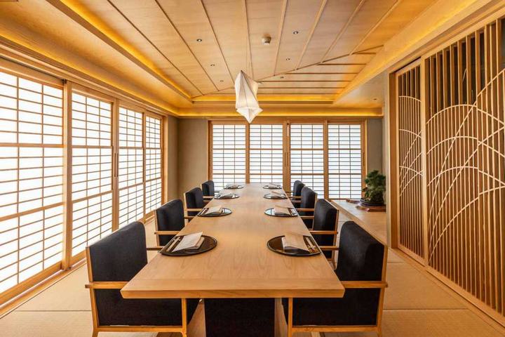 我们采用日式旅馆榻榻米风格,让客人可以用五感来感受日本。我们设计了一个类似红酒窖的日本酒窖于玄关过道来欢迎客人。此外,它也是前往私人包间前的一个美食的设计点缀。在入口处,有一个寿司吧台和一个炉边烧柜台,在走廊的中央,还有一个提供茶的吧台。有四间以四季为主题的私人包间和两间大型贵宾包间,每间都拥有不同的日式庭园设计,象征日式旅馆贵宾房一样的私人空间。此外,在仅限VIP贵宾享用的寿司吧台,客人可以享受寿司师傅在眼前握寿司的临场感。为了致力于使用日本原汁原味的材料,例如树龄约200年的木曾桧吧台、琉球的榻榻米垫、手工制作的日本纸、以及装饰品和餐具等,我们与业主共同从日本搜寻各种建材并进口到中国。加上以花菖蒲的花瓣和叶子为图像设计,在家具及门片等空间中达到花瓣飞舞散落的华丽效果。