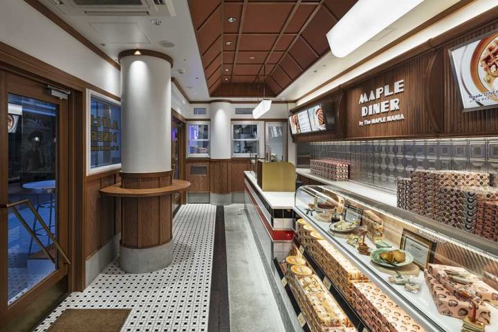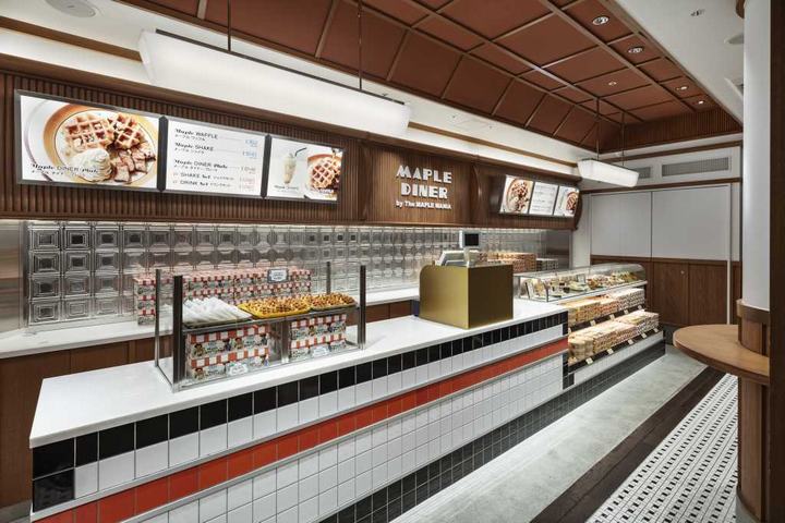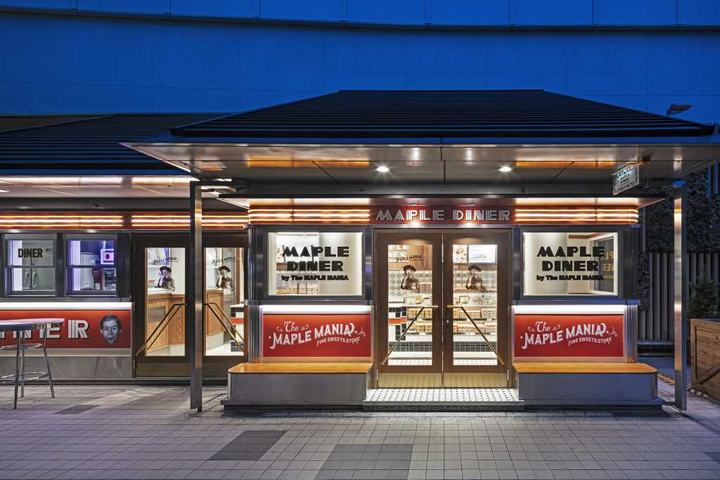 “MAPLE DINER by the MAPLE MANIA”是由连续4年获得东京站特产排行榜第1名,主营枫糖黄油饼干的“the MAPLE MANIA”,全新衍生而来的新品牌。店铺想要呈现出的主题印象是“枫糖坊”,日常爱用店。店铺位于连接新宿站西口与南口的“新宿MYLORD的MOSAIC街道”临街的室外区域。因来往列车通往下层街道,所以此处处于整日人流不息的地理位置。尽可能发挥狭长区域的优势,联想到过去车辆再利用的汽车食堂时代,以古老美丽的美国餐厅为基础,以当时的餐厅吧台为原型,设计了接待客人、商品陈列的柜台。穿行于来往通道的人们,可以看见厨房内的制作情况,以及华夫饼,枫糖浆的阵阵飘香,诱惑着人们的味蕾,以激起购买欲为意图设计而成的。(室谷丞一郎/ZYCC)