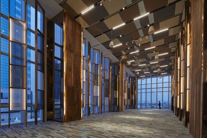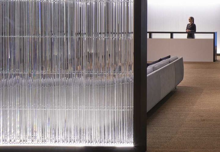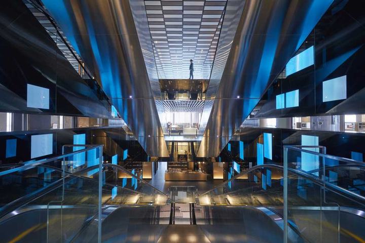 TOTO印度尼西亚的新总部位于雅加达市中心,坐落在阳光强烈和快速发展的繁华城市中。我们这个项目的目标是通过“创造一个让人联想起清澈的水能丰富生活的体验空间”来反应出生活中室内设计的重要性。在办公室以及陈列室内,以TOTO的企业形象颜色蓝色为主要基调,用以表现入口处的“反射城市的水光”、连接各层的电动扶梯壁面上的“水流中的光”以及陈列室的“寂静池面的光”。