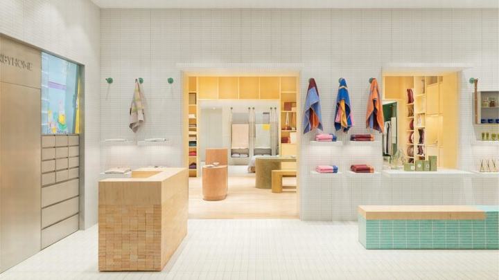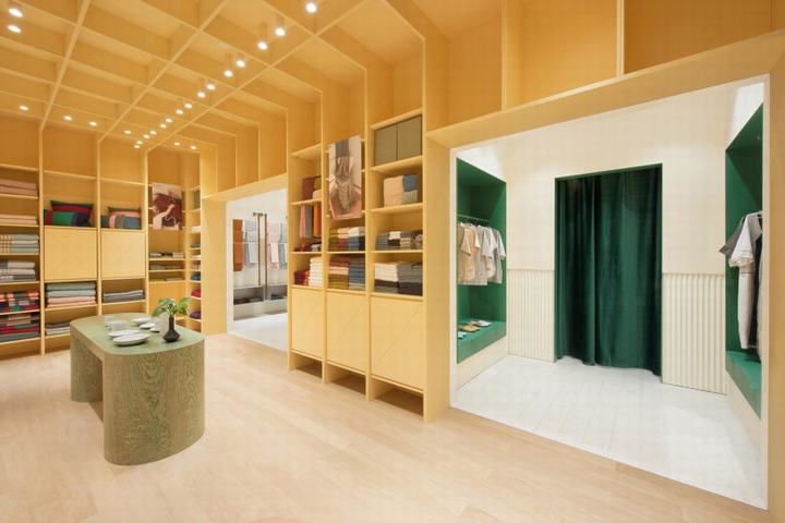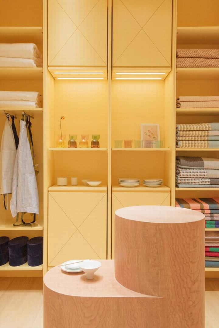 在院子的另一边,主要的杂货店空间有落地式的木制货架,用于展示和储存。从黄色的超负荷,卧室和衣柜空间的特点是白色和简单的材料色调柔和,以便让聚光灯的亚麻布和睡衣系列。