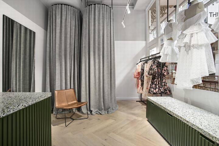 店内的细木工是定制设计的,豪华的饰面,如水磨石和人字呢。试衣间是由一个迷人的,长的悬垂织物在弯曲的轨道上建造的。