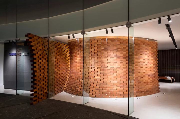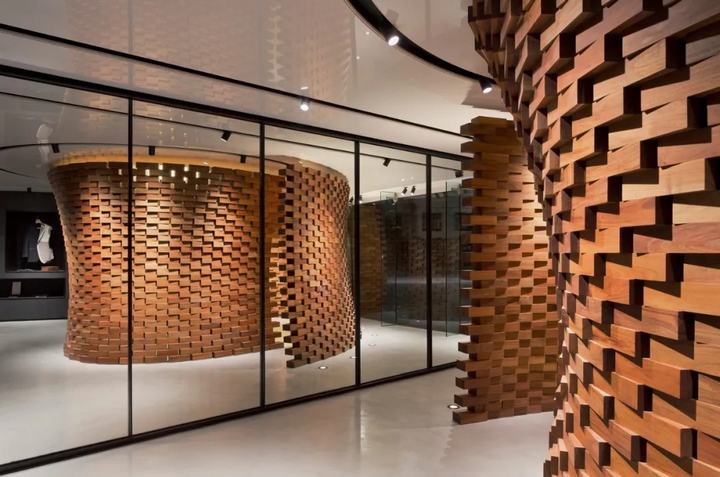 这家店铺为客户提供最高档的私人订制西服,手工编织的面料选自在全球范围内都享有盛名的纺织厂。店铺的前端是一面9米宽的透明玻璃作为其橱窗展示区。地板和天花板都反射并让在店铺中央,由2050块木块建成的装饰品更为显著。壁龛将任何一位进来的人环绕在内,是前所未有的独特奢华的体验,这里成列也是近几十年来最为卓越精致的商品。这是一个展望未来又将传统与创新完美融合的设计,象征着现代男士特有的的意识形态。