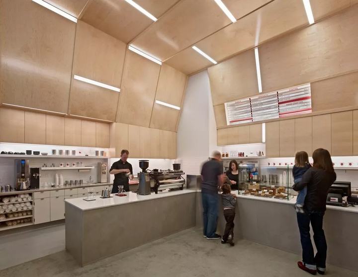 以前用于仓储的,金融区中心的现有空间很小,不到500平方英尺,没有真正与众不同的建筑特色,除了高高的天花板和全高的玻璃店面。该店的主要目标是以能够满足金融区需求的迅速提供伊壁鸠鲁级咖啡:在极快节奏的环境中享受慢食体验。为了最好地满足这一需求,我们决定,咖啡师人数的增加比座位的安排更为重要。材料的数量被控制在最低限度,以免把狭小的空间压得喘不过气来。标准的4×8片预处理枫木胶合板被选择为其温暖和低成本的天花板和墙壁。底座的橱柜是用瓷砖包裹的,瓷砖被精确地挑选出来与混凝土地板相匹配。这两种主要的材料在柜台相遇,吸引了你对那里发生的艺术性的注意。从概念上讲,木质天花板和墙壁垂挂在白色的凯撒斯通柜台上,几乎就像一个舞台搭建了一个实习的框架。这一姿态突出了14′以上的空间天花板高度,并利用了广阔的店面。交错、高效的照明设备创造了一个发光的木质外壳,穿过建筑物的柱廊,为行人提供了一个灯塔。