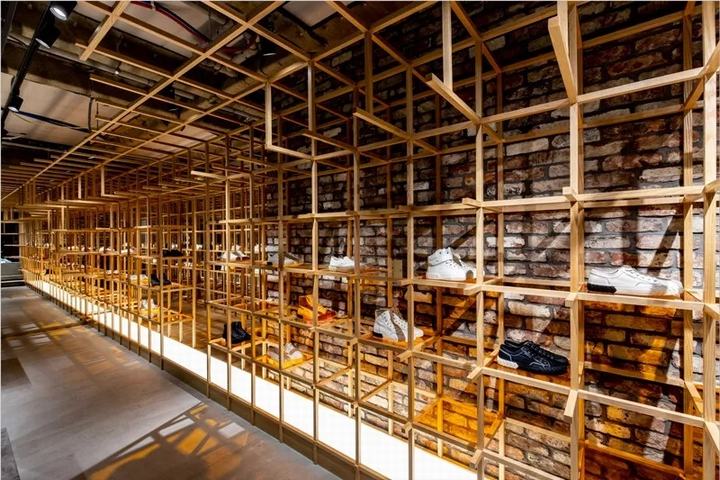 拉长的零售空间的一边排列着光滑的分层架子和大镜子,对面的场地看到一堵裸露的砖墙,上面叠加着复杂的脚手架式架子,架子甚至延伸到天花板和商店正面。一堆看似堆叠的街区向商店后面延伸。