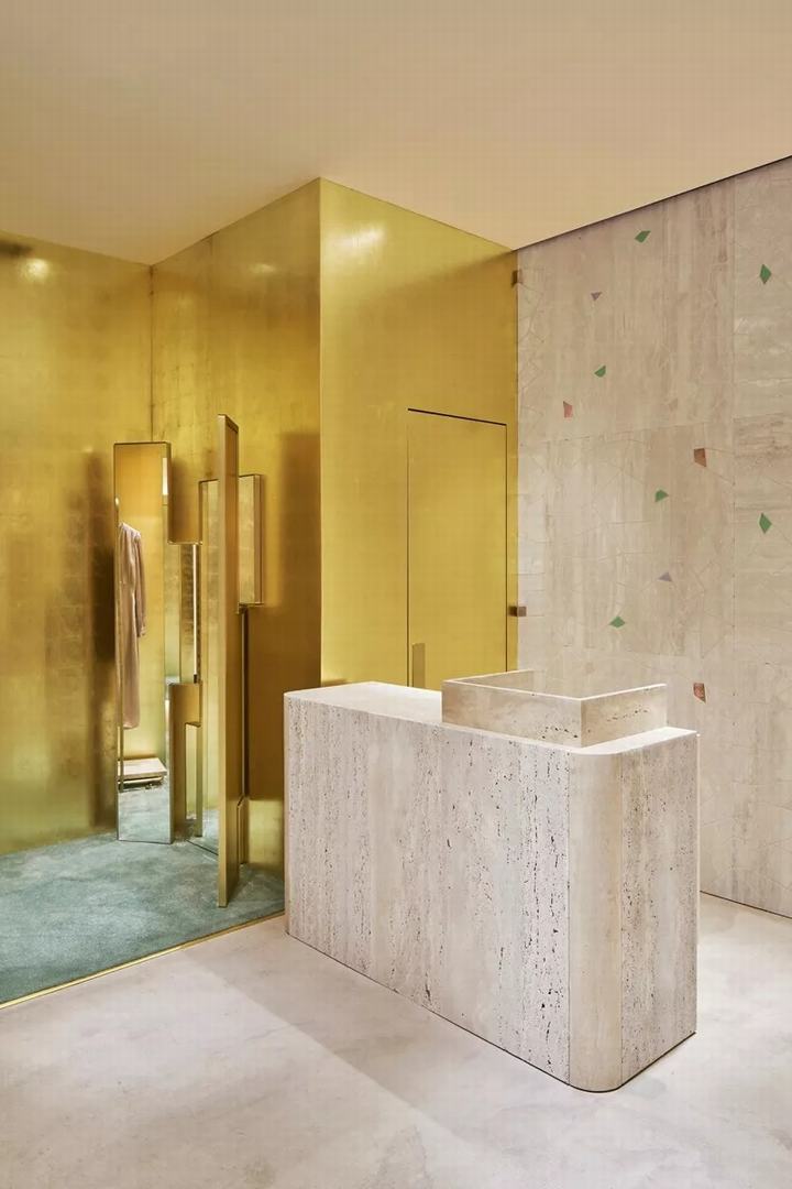 该设置由一个适合的转角单元设计,由forte_forte设计的内部设计团队,周围遍布石灰华大理石。后面的墙壁上覆盖着大块平板,上面散布着由古老的威尼斯铸造厂生产的抛光黄铜和彩色马赛克玻璃碎片,销售台和其他家具也用相同的材料制成。