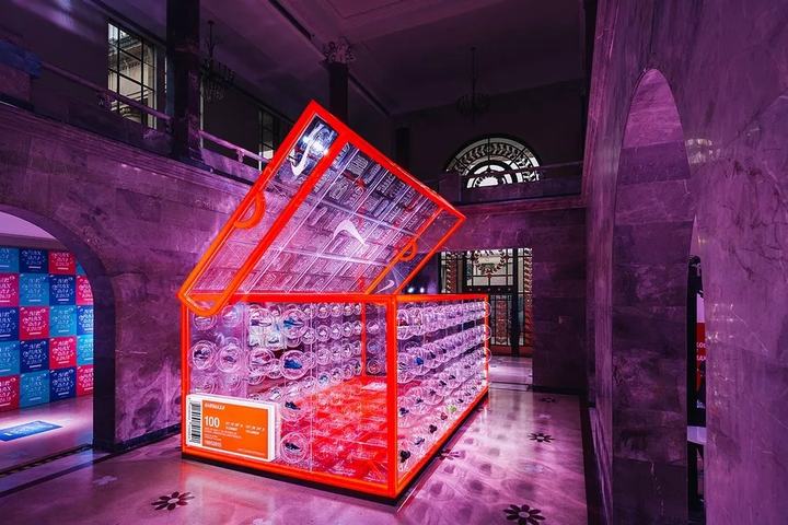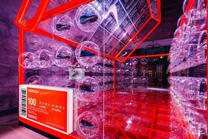 耐克AMD pop-up空间是作为一个完全沉浸式的Air Max体验在上海设计。在中心部分,设计师们设计了一个超大的钢框耐克运动鞋盒子,透明的墙壁上有一排排气泡,展示了罕见的air Max示例。为了传播宣传信息,Rosie Lee推出了Mobile air Max,并设计了两辆货车,以反映air Max运动鞋的配色。其理念是围绕Air Max Day提供宣传,邀请客户通过iPad与AMD建立数字预购站,并有机会赢得比赛。