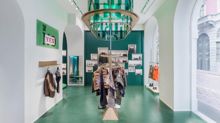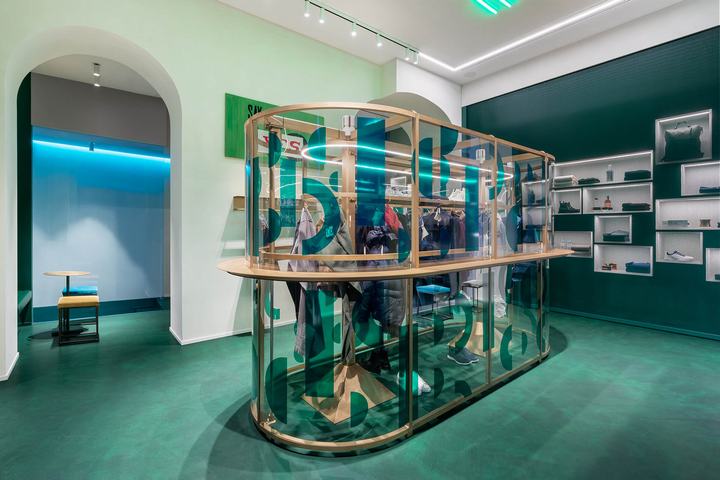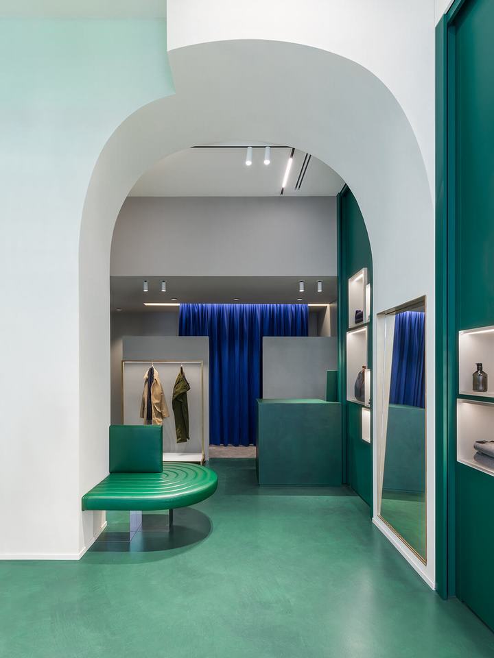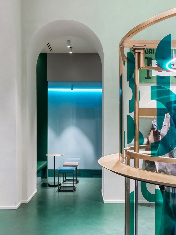 经过立面的三个拱门,前面和中间矗立着“展示装置”。在商店内外都可以看到,这个装置是一个产品展示系统,在晚上变成一个展示柜和吧台。它吸引了从商店路过的人来体验其余的空间,突出了具有现代风格的“经典米兰建筑”的基本精神。