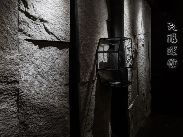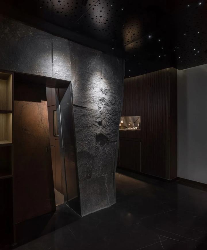 由于商场的防火要求,我们用木皮层压板做橱柜。吊顶采用穿孔铝板,解决空调回风问题。天花板采用拼接成型,洞内采用光纤灯,星光点点,衬托出石墙效果。