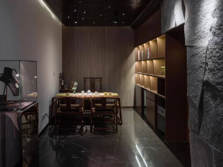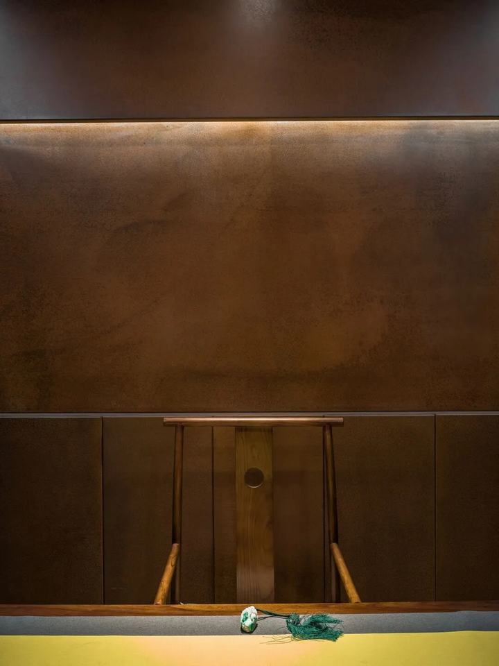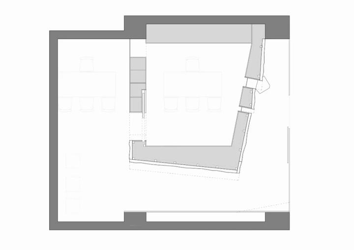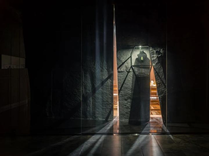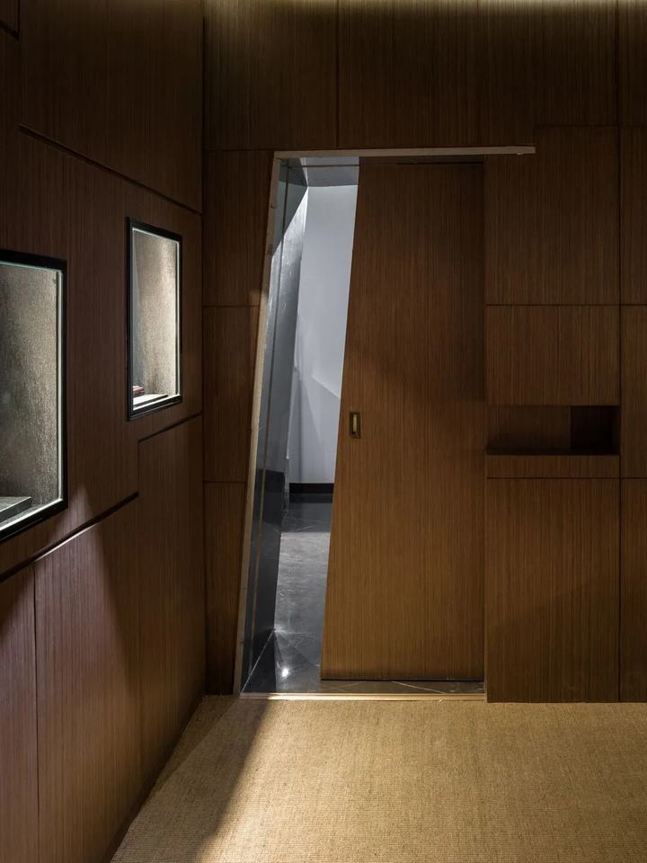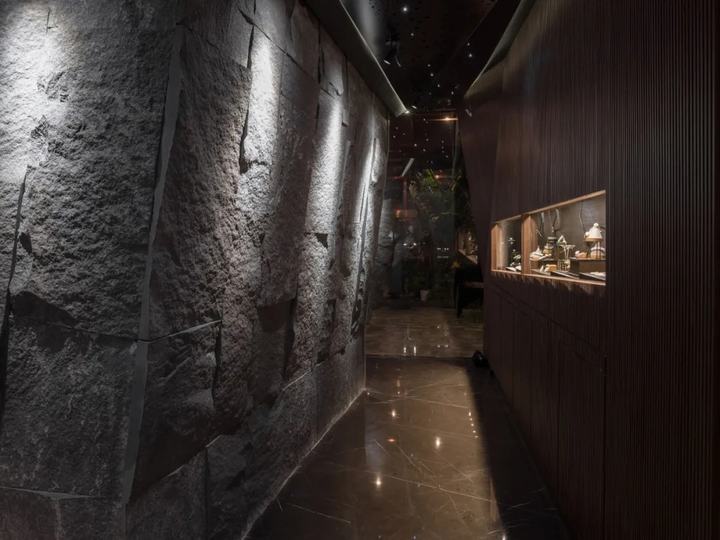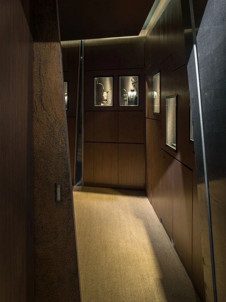 出售昂贵珠宝的过程需要外部展示和私人咨询。私人谈判和珠宝的宝藏是空间和概念的核心。与藏宝屋相对应,我们设计了一条从外部进入的路径,并缓慢延伸。走进来的客人将体验石头墙的自然力量,也将绕过巨石,参观木制格栅墙上的水平长橱窗。长长的窗户逐渐爬升变窄。客人终于绕过石屋的尖角,穿过茶室,打开耐候钢推拉门,进入宝库,观看珠宝。