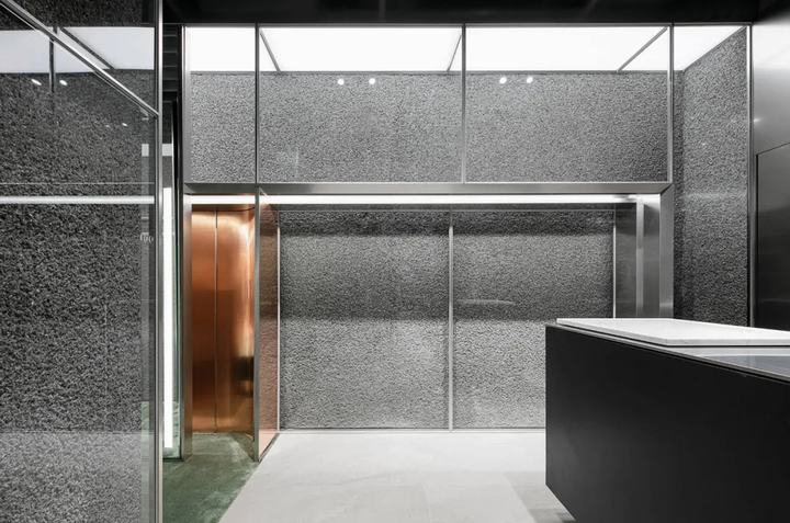 枫木和石材面板也被框在整个室内,零星的彩色家具为原本冰冷的美学增添了温暖,并进一步扩展了空间作为展示橱窗的概念。