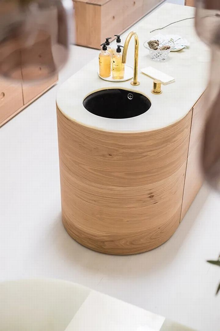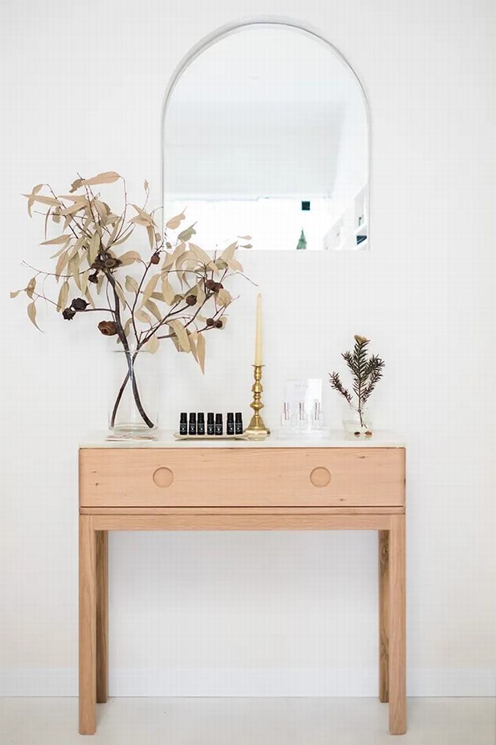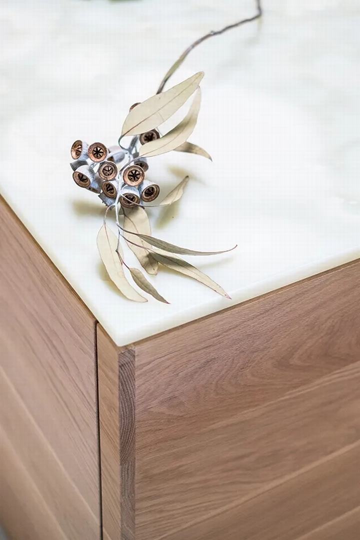 关键材料中的两种是绿玛瑙(它让人联想到绿色的池塘或树叶的灰绿色色调)以及天然橡木。搭配精美,我特别喜欢弧形柜台。种植箱在墙壁上排成一行,非常适合展示澳大利亚灌木丛的雕塑叶子,而黄铜饰物则贯穿其中。选择这种饰物是参考1900年代初帕丁顿定居时维多利亚时代房屋中广泛使用的黄铜。镜子,门口和家具周围的拱门形状反映了那个时代的美丽建筑。