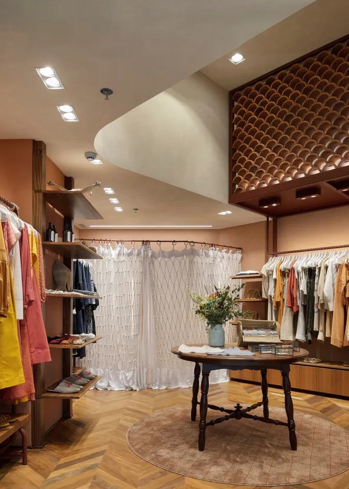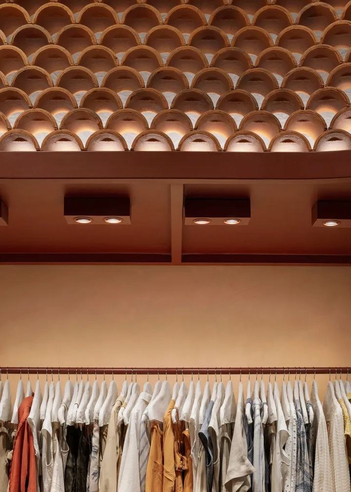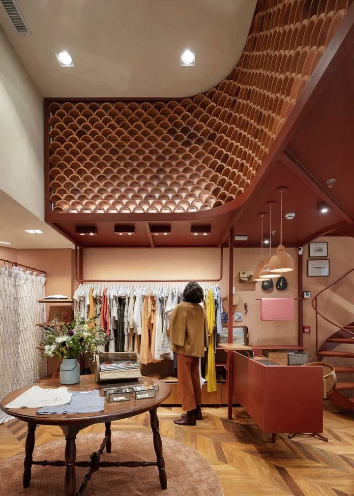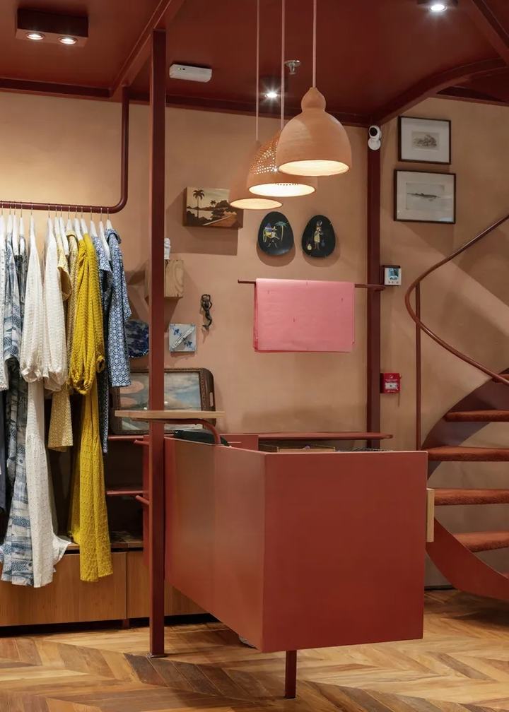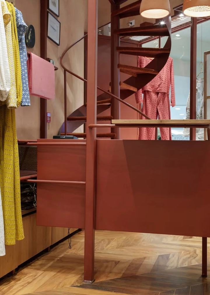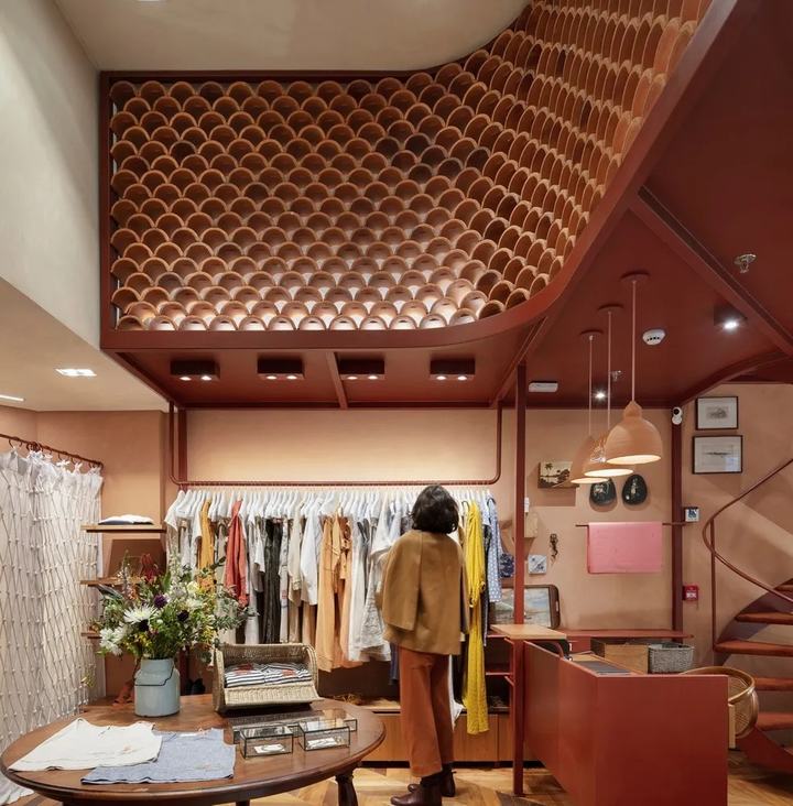 Le Soleil de ‘ete新商店的建筑项目的回应是通过嵌入一个由金属薄型材构成的水体,这些薄型材将自己塑造成空间的形状。六根爪柱支撑着仓库,仓库是由粘土瓦制成的鳞片表皮支撑的。其他的一切——螺旋形的楼梯、陈列柜、更衣室、包装桌、柜台、衣架、橱柜和衣服——都与身体相连,就像海岩上的礁石一样。