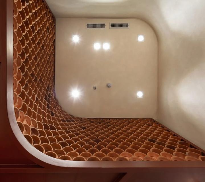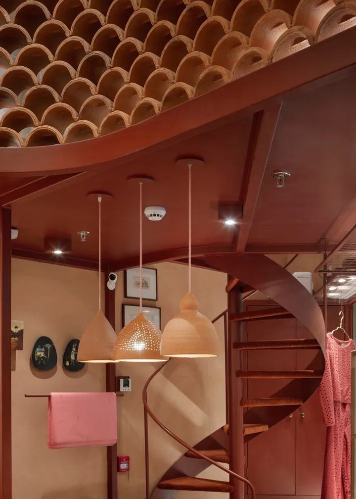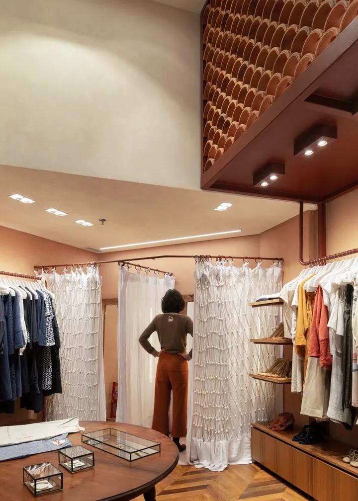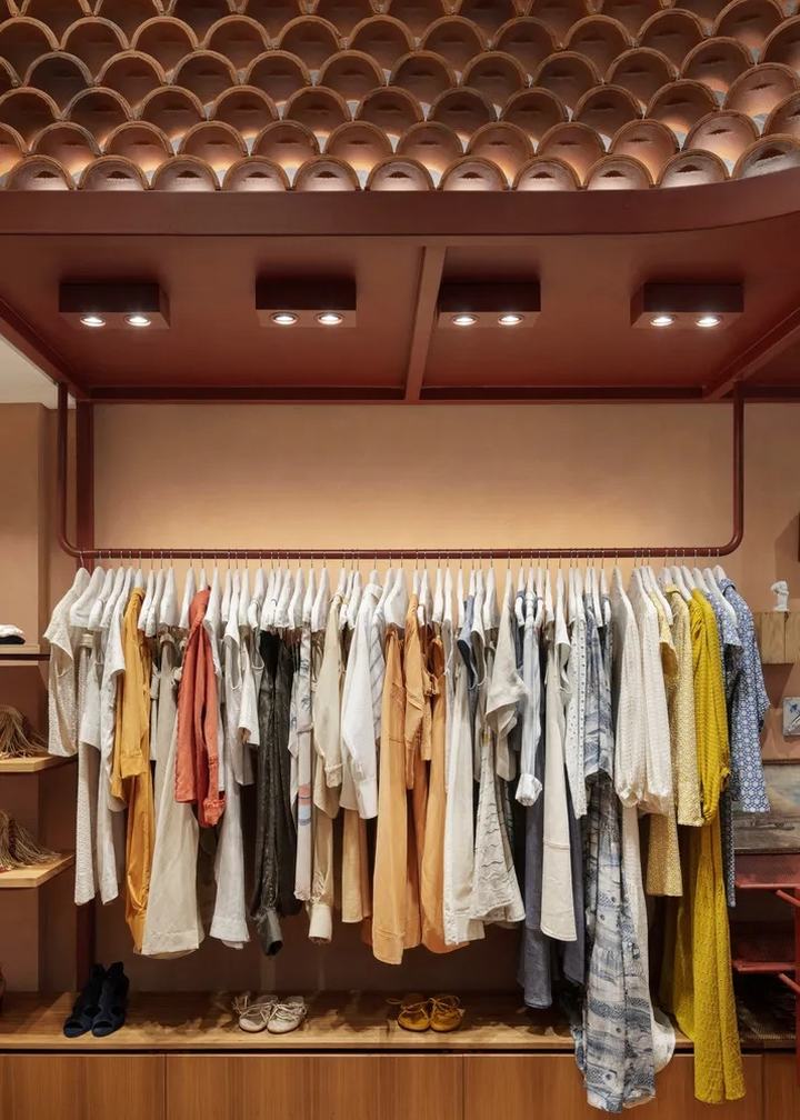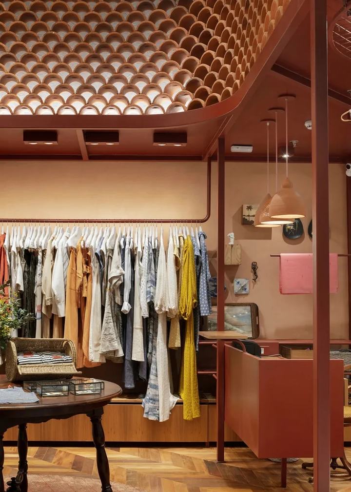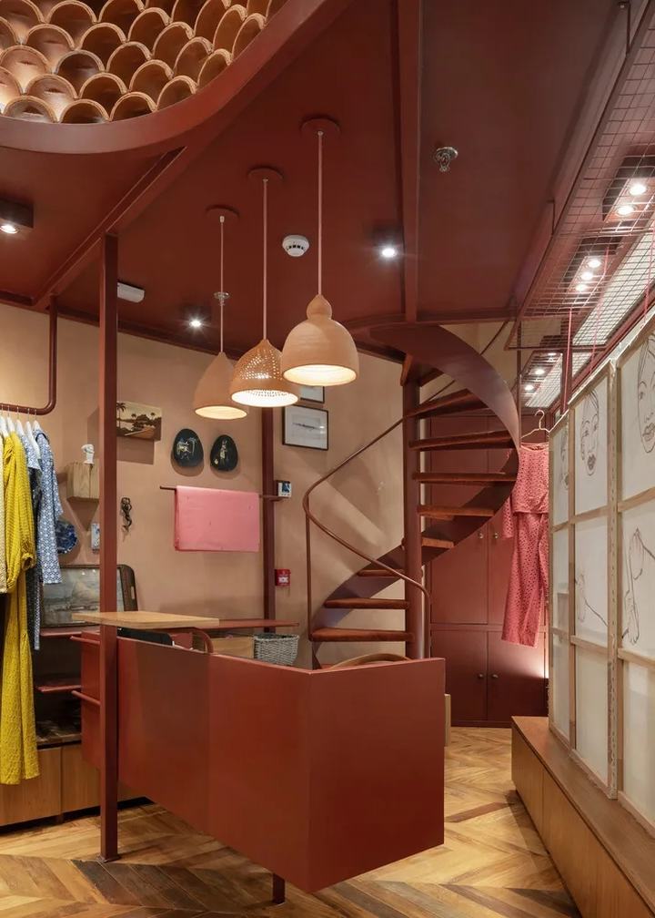 Le Soleil de ‘ete新商店的建筑项目的回应是通过嵌入一个由金属薄型材构成的水体,这些薄型材将自己塑造成空间的形状。六根爪柱支撑着仓库,仓库是由粘土瓦制成的鳞片表皮支撑的。其他的一切——螺旋形的楼梯、陈列柜、更衣室、包装桌、柜台、衣架、橱柜和衣服——都与身体相连,就像海岩上的礁石一样。