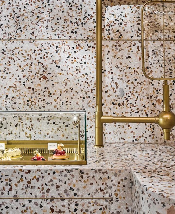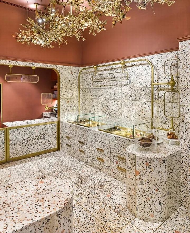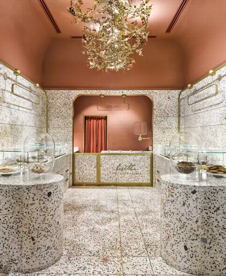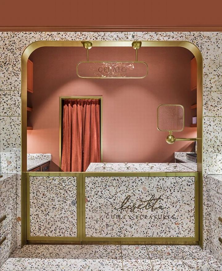 带有黄铜旋钮的冰激凌展台用水磨石板伪装,反映出Nēowe对细节的刻意关注。定制的桌子与空间中使用的材料和几何结构相匹配,包括黄铜和水磨石的组合,而标有“lisette”字样的座椅则强调了品牌的美学和永恒的设计方法。
