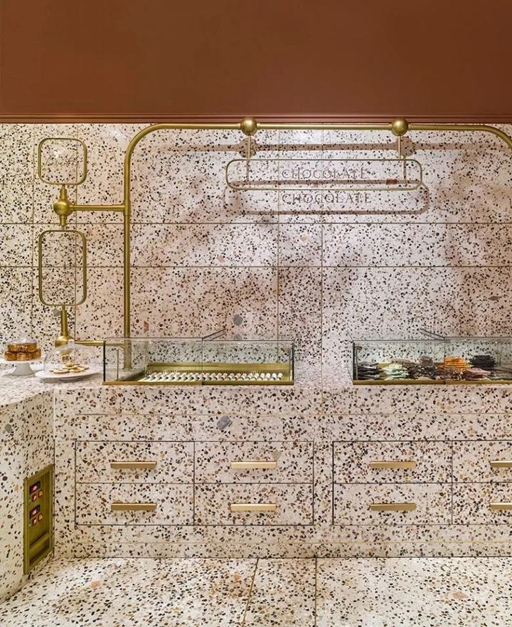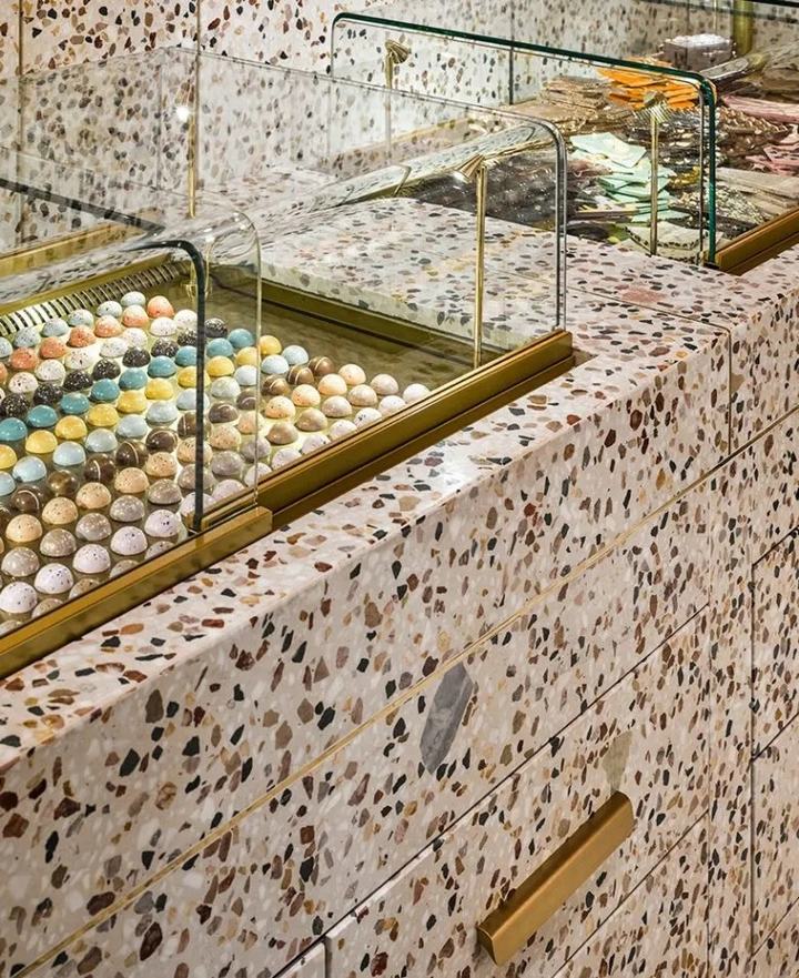 材料和颜色的调色板参考了品牌的美学,创造了一个温暖,详细,多层次的空间。内部为游客提供了一个巧克力盒幻觉,是由一块水磨石立方体雕刻而成。展示单位,覆盖着手工水磨石瓷砖,提供了表面之间的无缝过渡和空间的连续性。