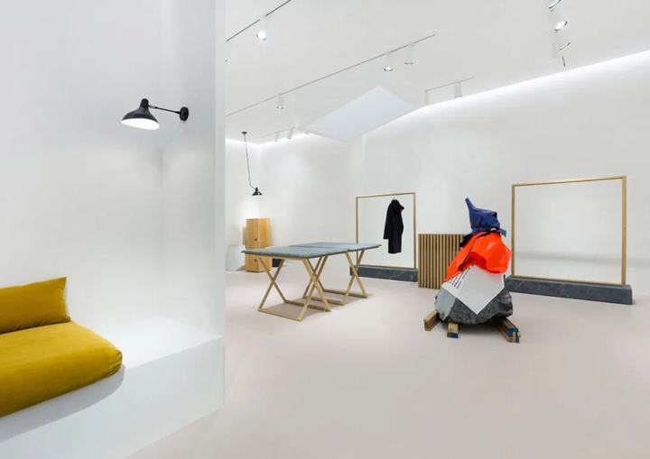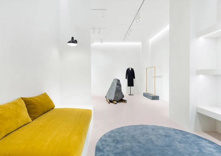 芥末黄的坐垫和淡蓝色的大地毯更增添了色彩。锯齿状的大理石搭在木板上,放置在整个商店的关键点上,巧妙地参考了工作室为Loreak制作的一个类似采石场景观的短片。