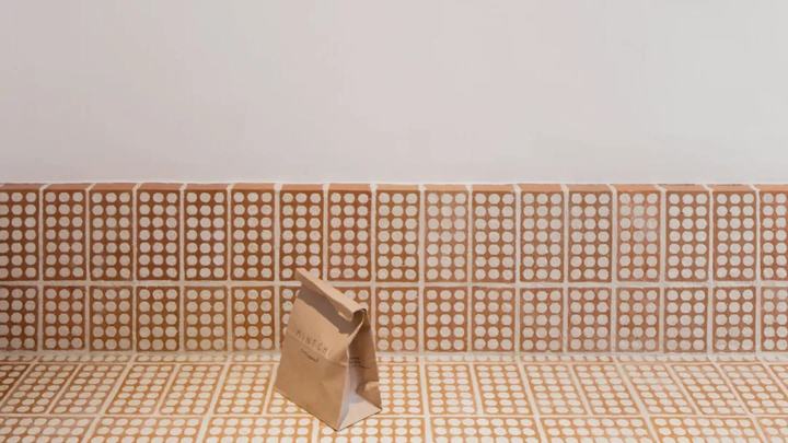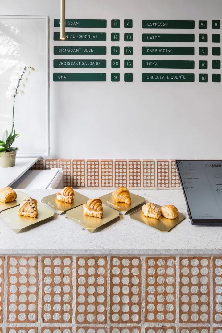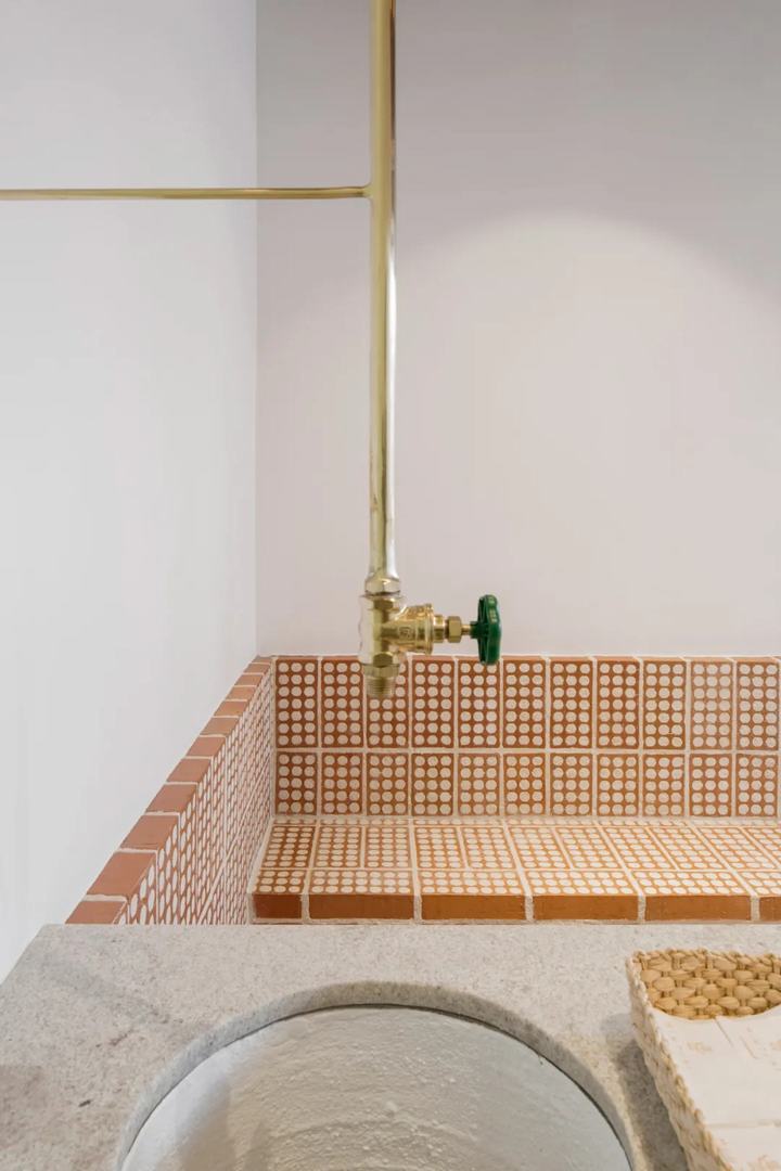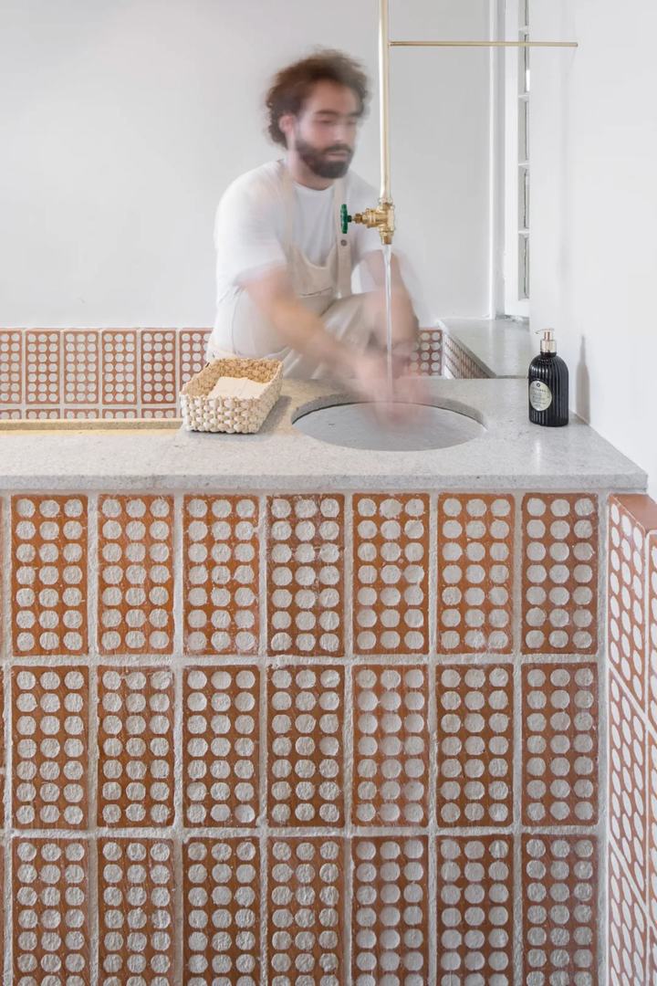 其他细节包括从天花板向下延伸的黄铜管道,形成一个水龙头,在面盆上方,面包师可以在那里洗手。“黄铜的细节让人想起羊角面包的金色,而砖块和纸板让人想起刚从烤箱里拿出来的温暖,”Maurelio补充道。