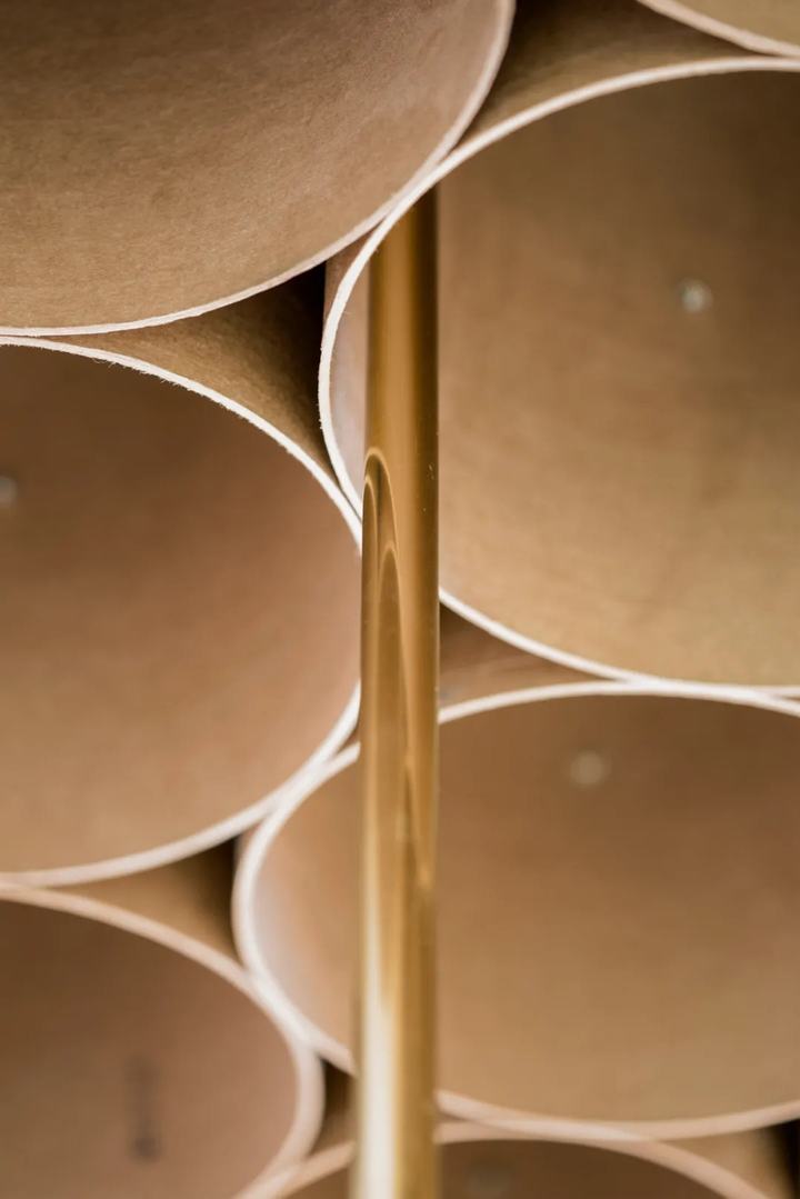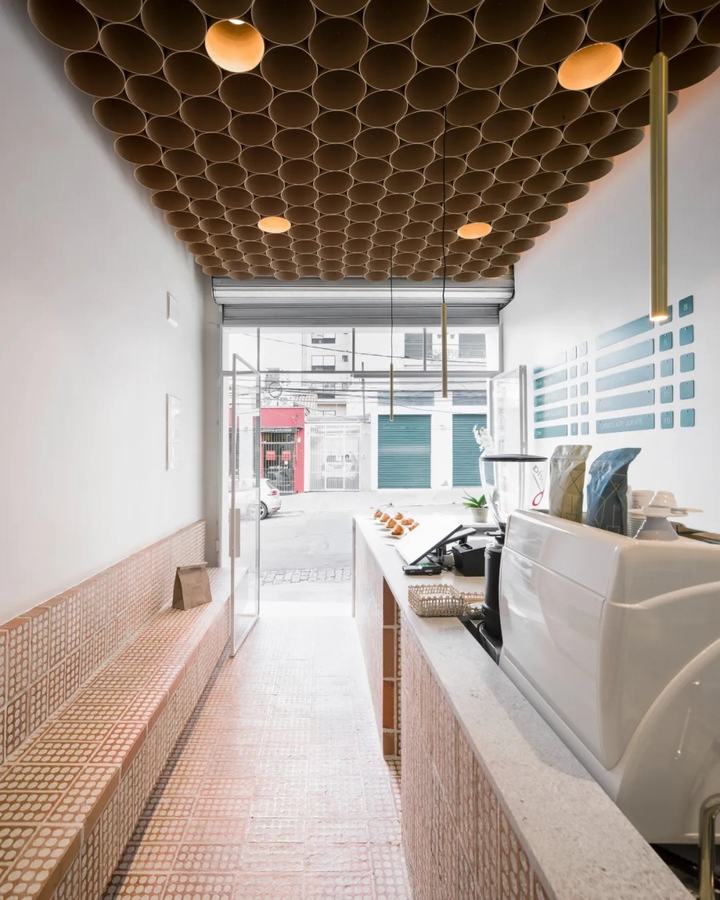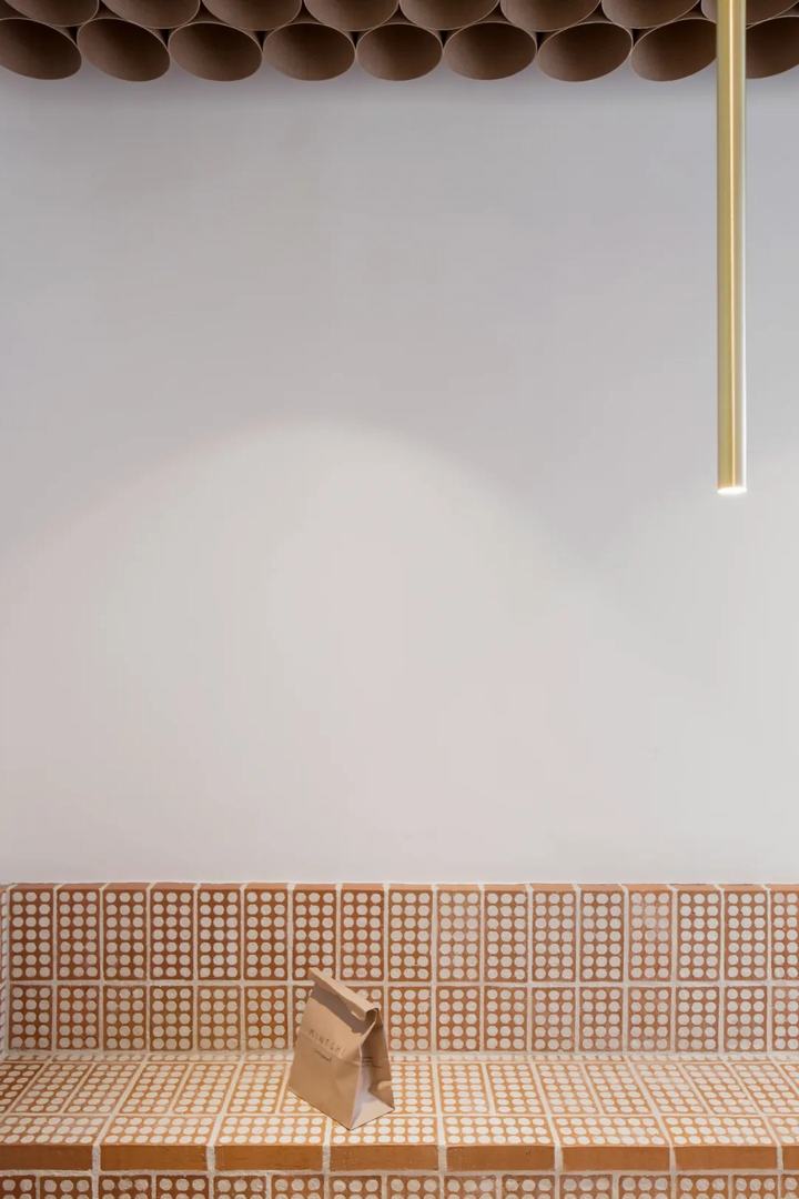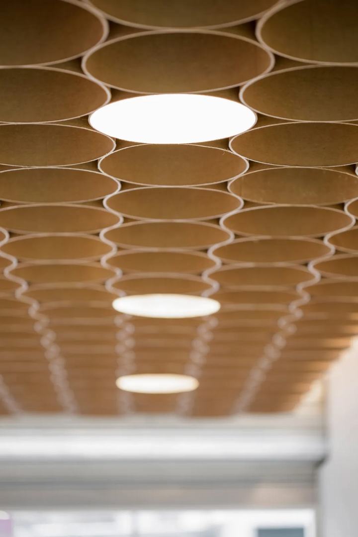 硬纸板管覆盖了面包店的天花板,“以实现预期的轻盈效果”。照明功能是嵌入到一些管,而细长的黄铜照明吊坠挂下来,通过一些间隙之间。