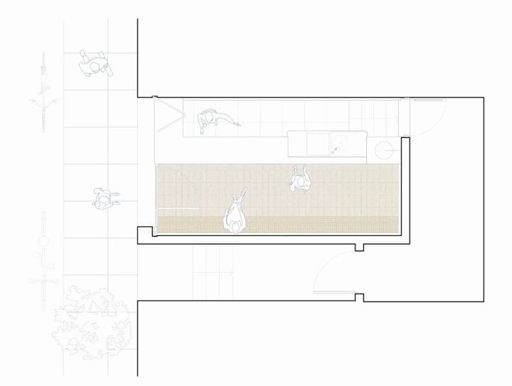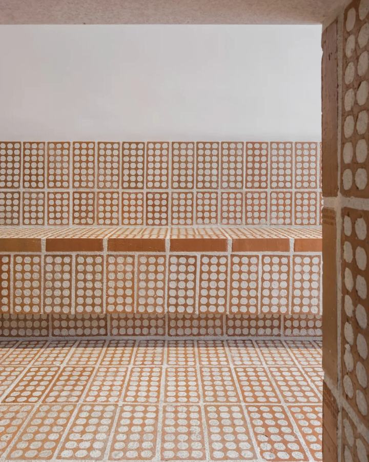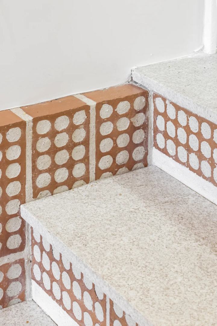 根据Maurelio的说法,第一层是地板、工作台面和长凳座位。这些元素都是用穿孔的陶土砖制成的,这些砖通常填满了混凝土。只要有可能,砖块的顶部会显示出来,而不是侧面。这就产生了一种图形效果,混凝土填充了小的圆形间隙,并形成了每个块的轮廓。