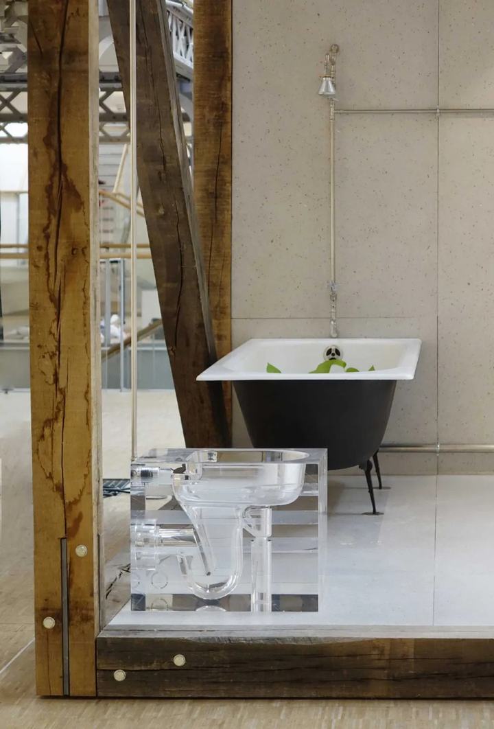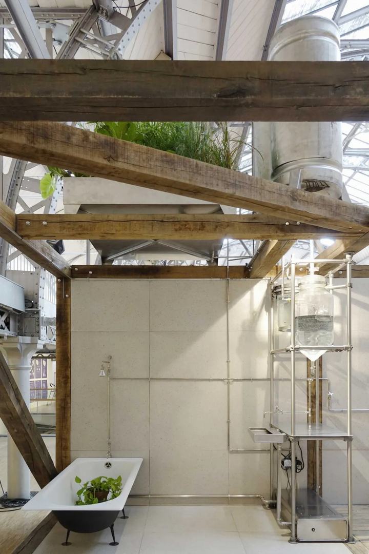 “露天卧室的屋顶上有两个外露的水箱;一个用于收集雨水,另一个用于储存植物净化厂和活性炭过滤器制造的可饮用的水。浴缸和水槽连接到水泵和过滤器系统,处理和补充水进入回路。透明的马桶里分别收集了人类的尿液和粪便,它们都被转化成了肥料和生物质。