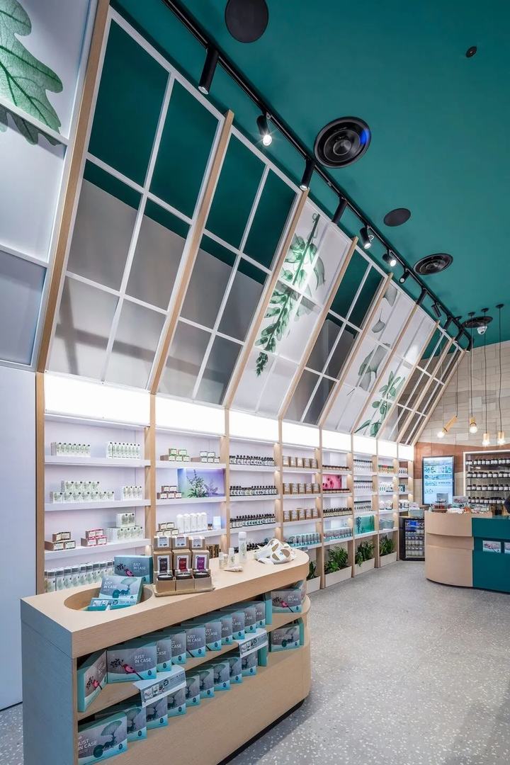 商店的所有墙壁都是窗户上的花盆,植物向上生长,突出了自然法则的内部秩序。架子由天然木材和白色胶木制成,形状像一个对称的温室,一直延伸到商店的天花板,创造了一个自然保护的角度。在货架的顶部,带有真实草药草图的轻型图形装置为顾客提供了了解生长过程的说明。