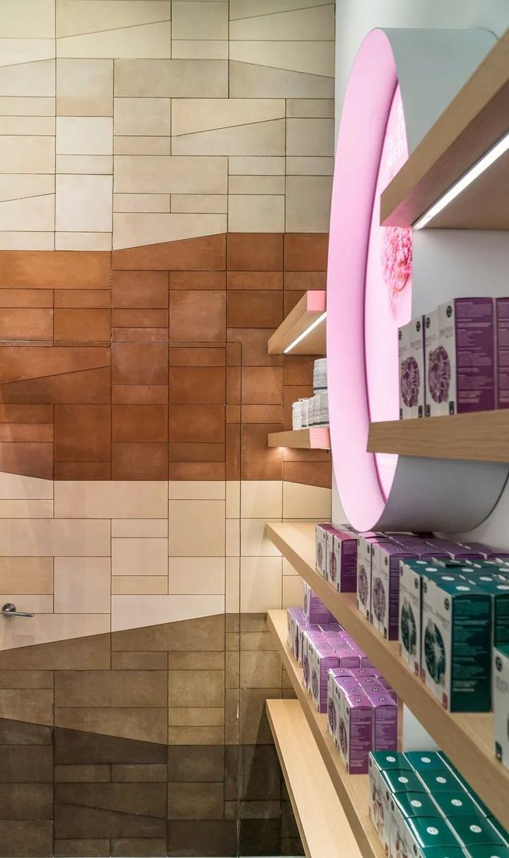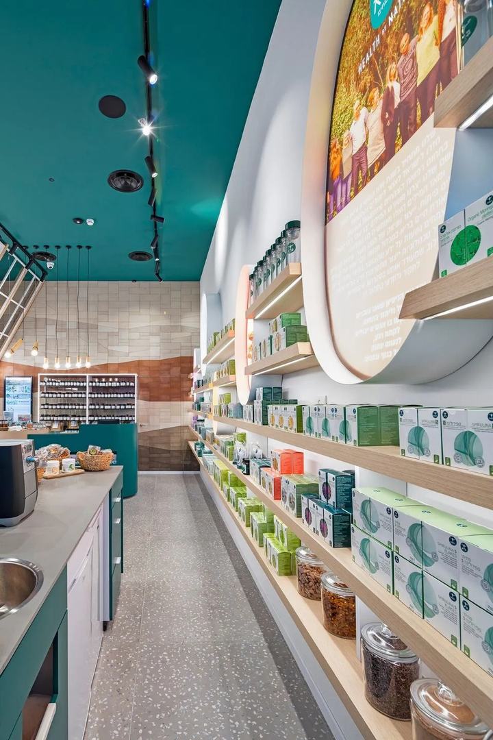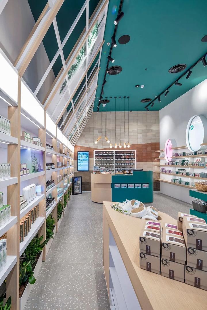 项目选用的材料——水磨石地面采用土色,客户服务桌和窗框采用该品牌的绿松石,后墙覆盖着一扇通往诊所的隐蔽门——由Criaterra土砖制成,这是一种强烈的天然呼吸砖,采用亲生物技术制造。该店的中心主题由设计师拉娜·瑞尔科(Lana Revenko)设计,深入植物内部,其动脉看上去就像人类的神经系统和血管。