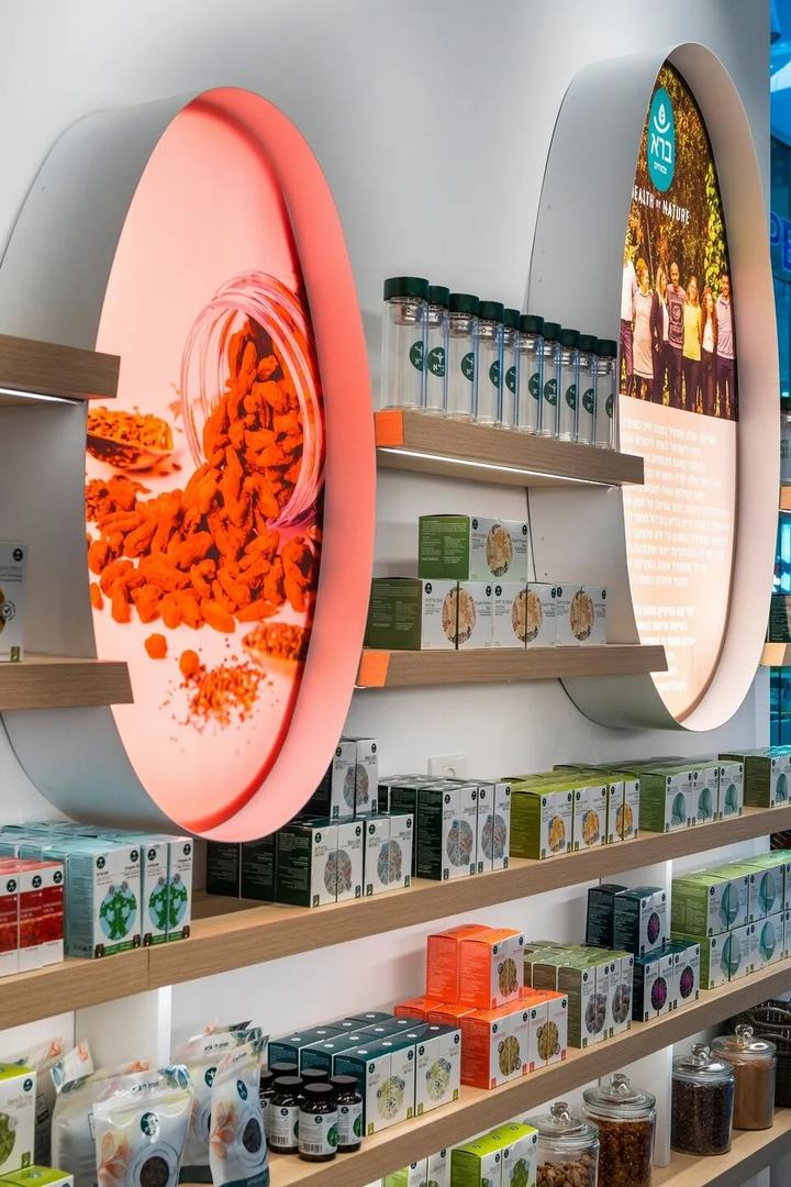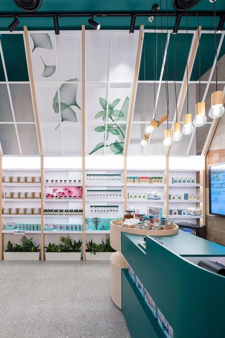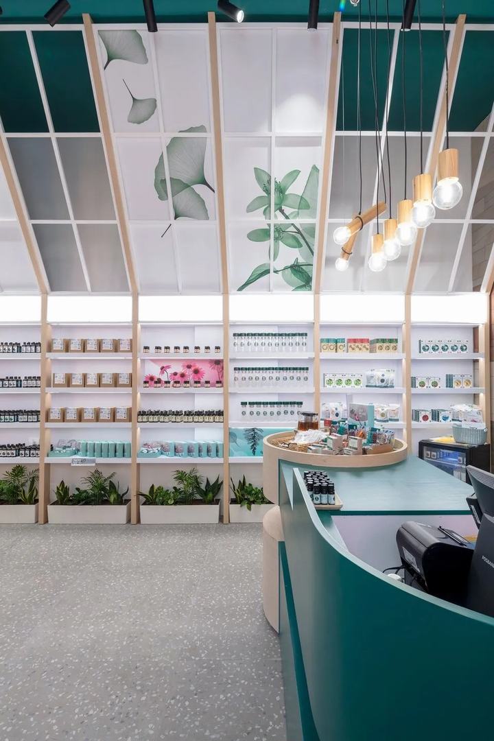 商店里的信息和帮助台有生物形态和人的线路,允许从各个方向进入,因此药剂师和工作人员之间没有区别——对顾客。所有人都可以获取信息。书架之间不同颜色的椭圆形信息气泡是令人印象深刻的正面标志,让人赏心悦目,保持信息的自然流动。