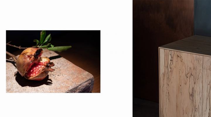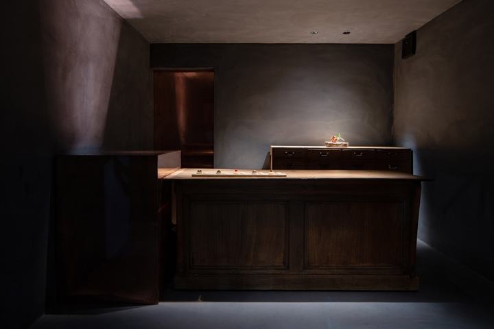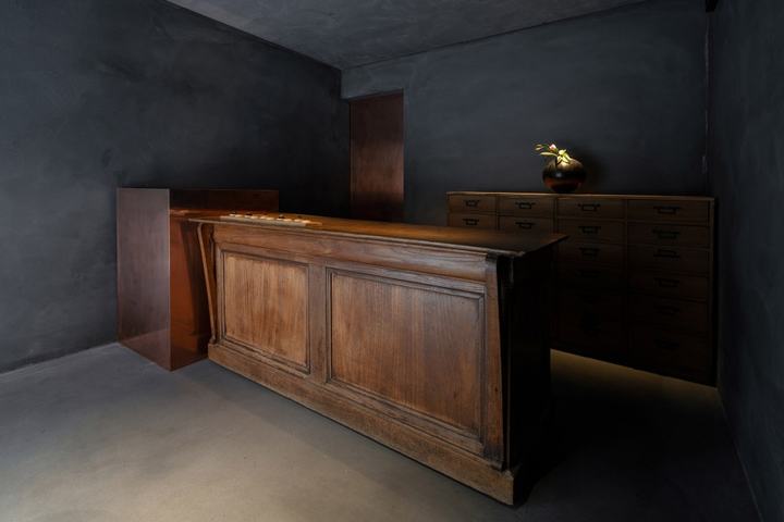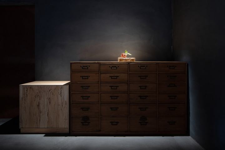 mitomi甜点和茶饮店收银台旁边的大柜台和墙边带有一系列小抽屉的斗柜是专门挑选的古董家具,这些家具很好地迎合了商店的氛围。 商店斗柜旁的低矮家具以日本马栗木制成,与古董家具的材料质感形成了和谐的对比搭配。在商店中盛放食物的器皿以衬托食物为目的,并未选用惹眼的材料来盛放食物,但是如果仔细观察还是能可从中感受设计者挑选它们时所花费的心思。
