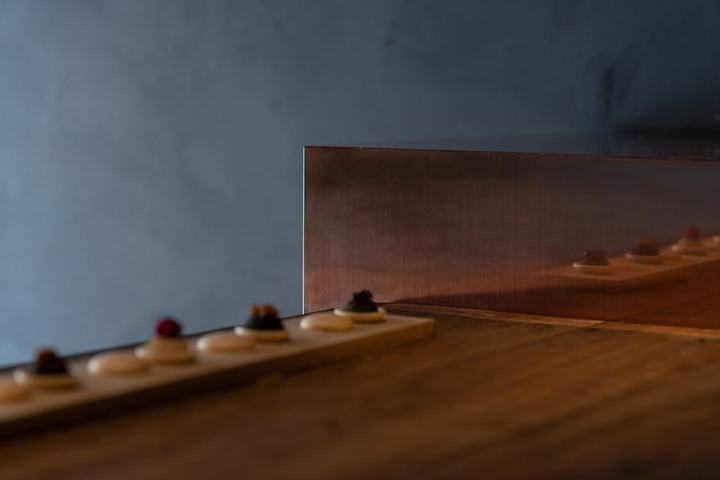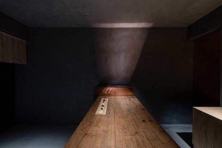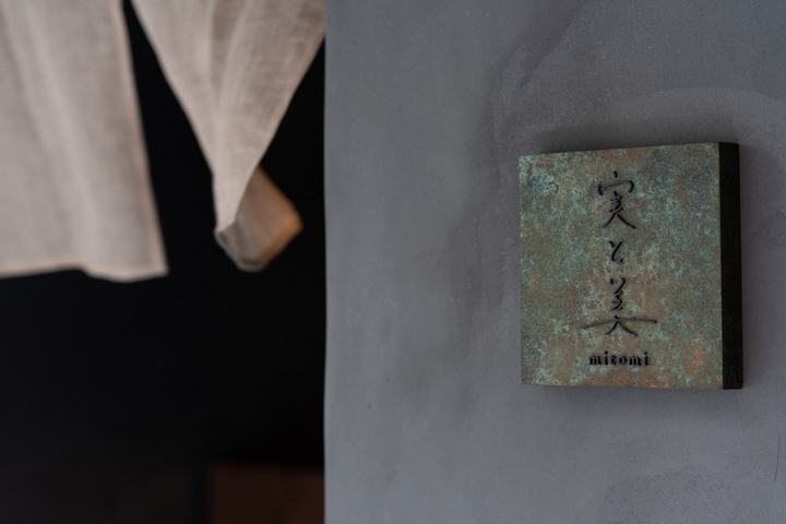 mitomi甜点和茶饮店在一座三层建筑的底层,商店由销售区和后厨区组成。商店每日提供特制的盒子展示monaka,并且每日只提供5种monaka,以便欣赏它们各具特色的美感。商店在地面、墙壁和天花板均采用黑色灰泥饰面,通向后厨的隔间和收银台使用了铜制板面,成为商店空间中相互呼应的焦点。在商店中,选用铜的原因在于其既可用于茶具,也能随着时间的推移而加深色泽,从而承载着一种安心长久的愿望。