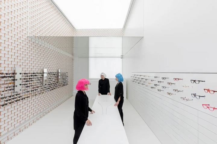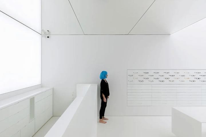 与金属幕墙相对的区域显示了视觉眼镜。我们使用了现有的抽屉(可容纳500个眼镜),这些抽屉以前分布在商店的各个侧面。它们不再用作单独的家具,而是用作清晰的白色垂直展览表面的一部分。