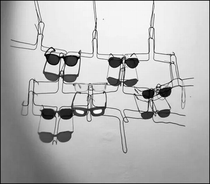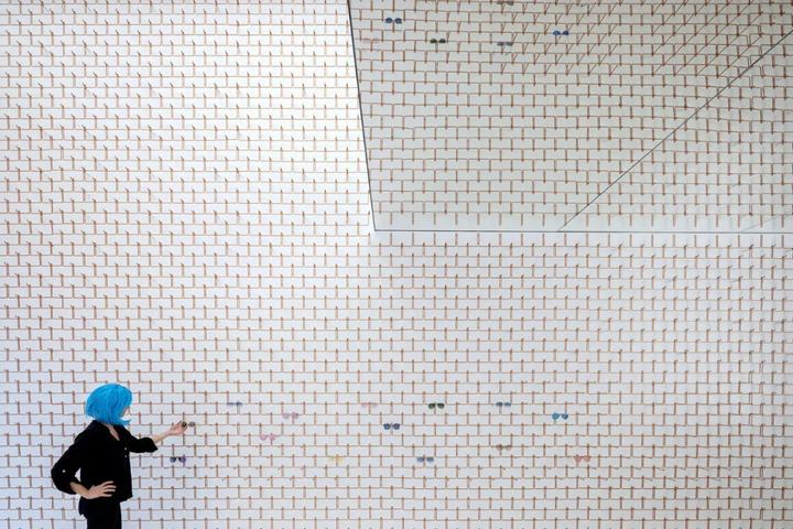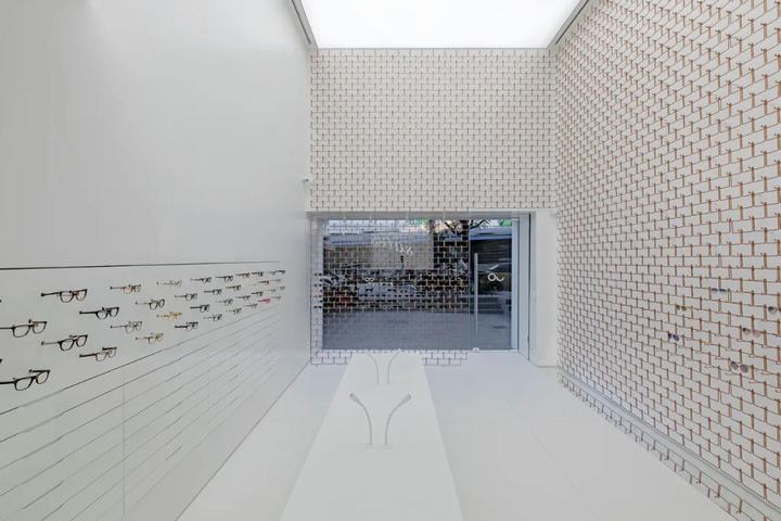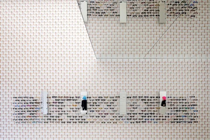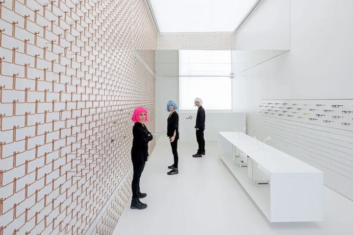 第一对表面(覆盖商店的正面和正面)是金属网格,旨在容纳太阳镜,镜子和公司徽标。通过将原始单位乘以一副眼镜的比例来制作网格设计,就像金属幕一样。总的来说,这种设计让人联想起原型结构元素,即页眉键合结构。这种严格的结构允许更大的自由度和重新构想的眼镜展示。