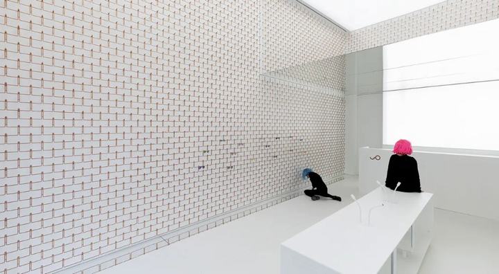 白色的表面可以折叠回到地板上,在那里有一个3米长的金属桌子用来测试玻璃。第三对表面是一个伽玛形状的镜面(4米宽),它围绕着现有的阁楼空间,几乎使它脱离了实体。这个反射面扩大了空间的尺寸。与地板上的线性反射表面相结合,它创造了网格的无限重复,让游客看到在他们面前展现的混乱,并专注于产品。