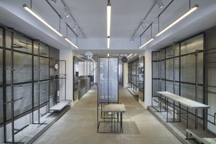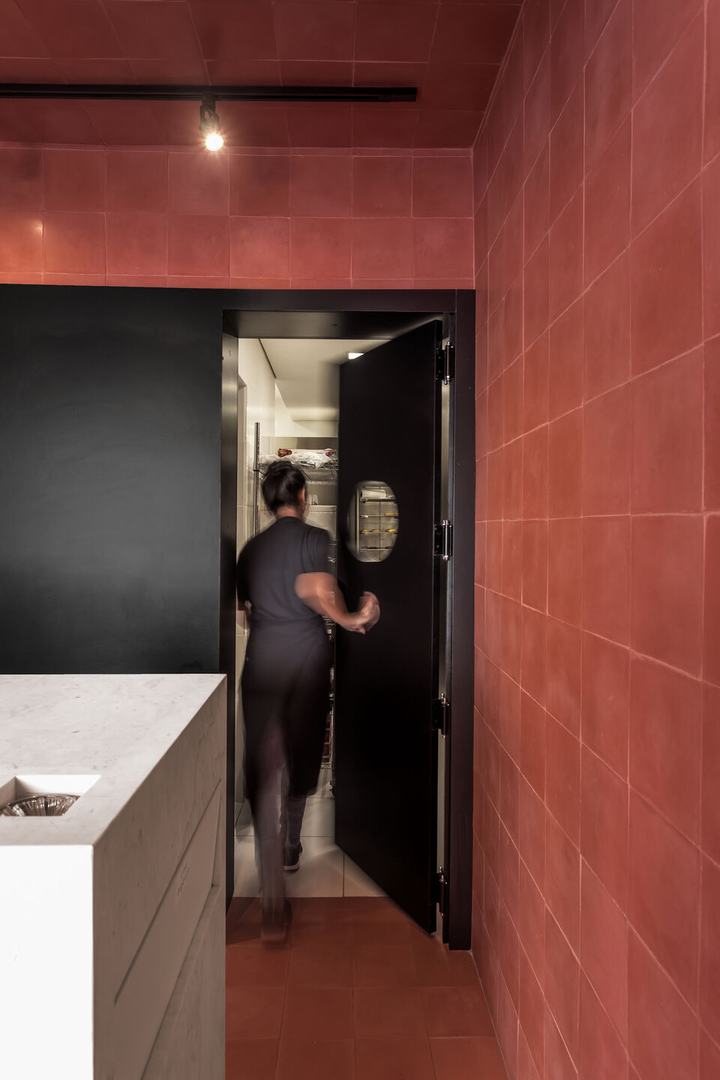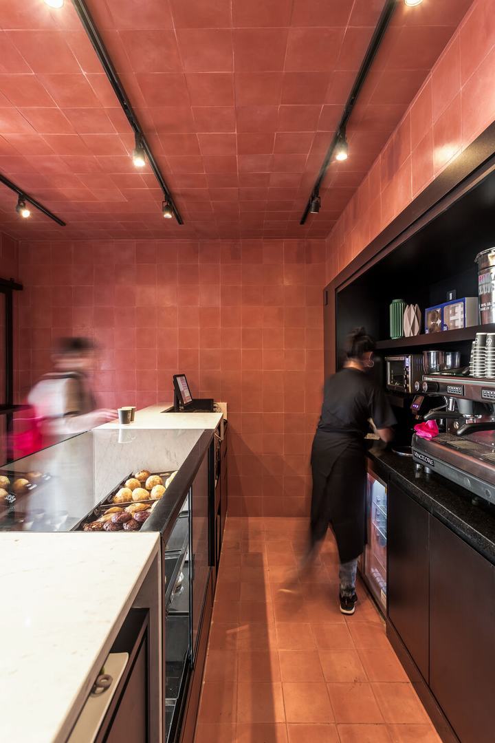 因此,瓷砖纹理应用于整个商店:地板,墙壁,立面和天花板,从而形成了空间单位。与此相反,有两个主要元素:白色石材和玻璃柜台,产品的陈列和展示都在其中;底部是黑色面板,那里有咖啡机,冰箱和厨房。