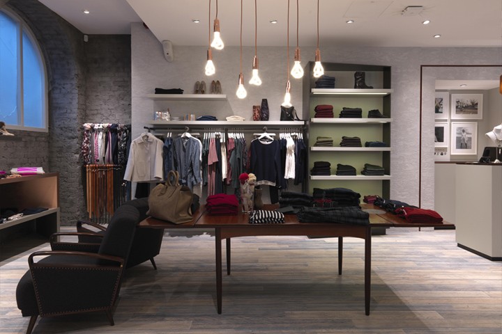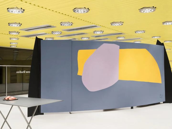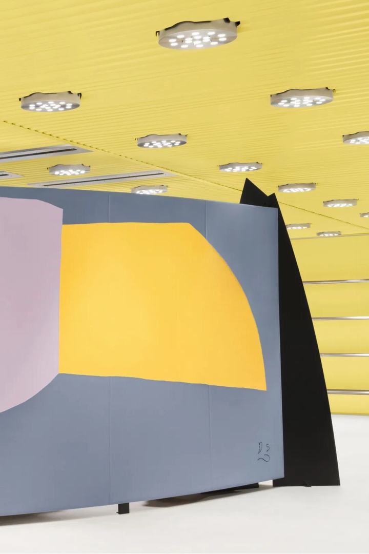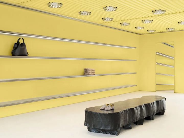 从地面到天花板的玻璃覆盖了整个正面,这意味着从街上就可以很清楚地看到这种颜色,尤其是在晚上。在房间的中央是一件由英国雕塑家西尔弗特别委托制作的艺术品,包括一系列带有与黄色互补的块状彩色图形的羊绒面板。面料由一个黑色的铝框架支撑,想试穿衣服的顾客可以进入这个结构。雕塑的想法源于简单的结构,比如临时搭建的庇护所,但西尔弗走得更远,他将自己的雕塑美学应用到裁剪织物上,形成了一种更机械的风格。