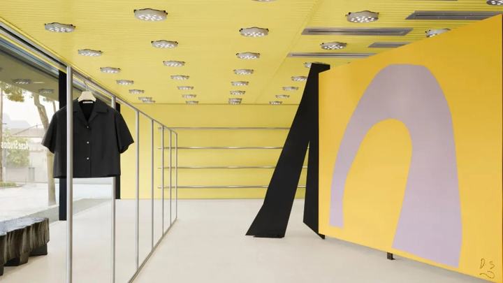 Acne Studios在西好莱坞新开了一家名为“淡酸性黄”(pale acid yellow)的店铺,店内摆放着艺术家丹尼尔·西尔弗(Daniel Silver)的一座雕塑,兼作试衣间。梅尔罗斯大道上的这家店是该时尚品牌在洛杉矶的第二家店,它坐落在时尚街区一个类似亭子的单层建筑里,许多高端时尚品牌都在这里开设了分店。由伦敦公司Geoff Crowther建筑事务所设计,空间由暗黄色主导,Acne Studios称之为淡酸性,覆盖了墙壁和波纹天花板。