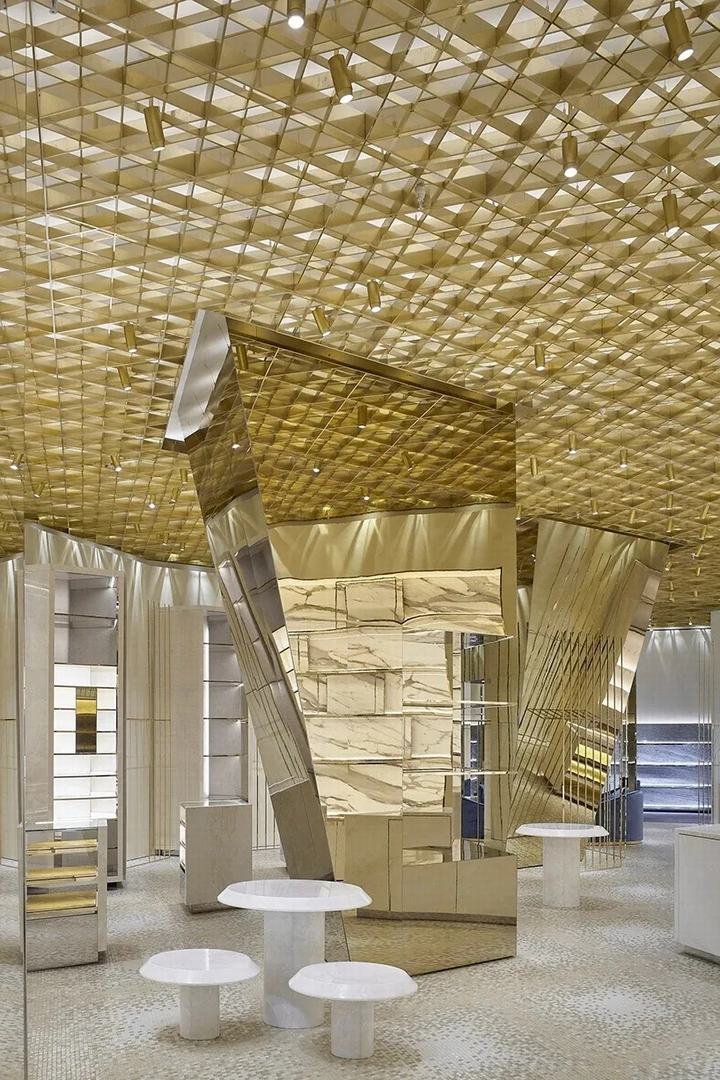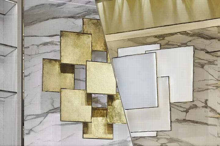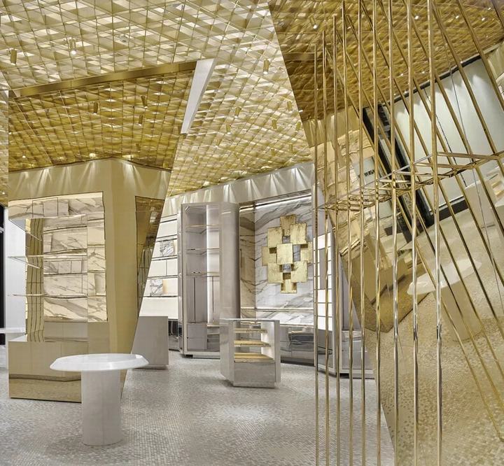 天花板上有一个钻石形状的图案,设计了商店的流程,引导游客流畅地从一个房间走到另一个房间。光线从它照射出来,并与它一起产生一种迷人的视觉效果。在室内,阴影、倒影和火花成为了肌理和实体。在垂直的青铜弦森林之外,鞋子沙龙与整个商店形成对比,以珠宝盒般的美学为特色。蓝色方解石的颜色补充了青铜饰面,而其他材料通过投射在墙上的可控阴影融合在一起。