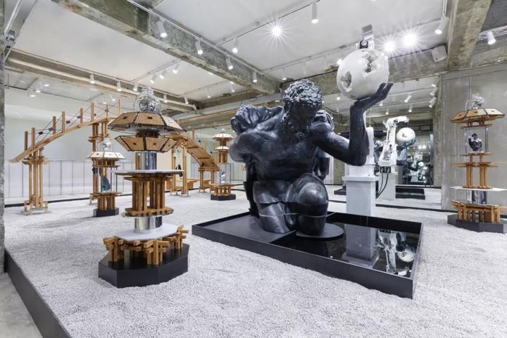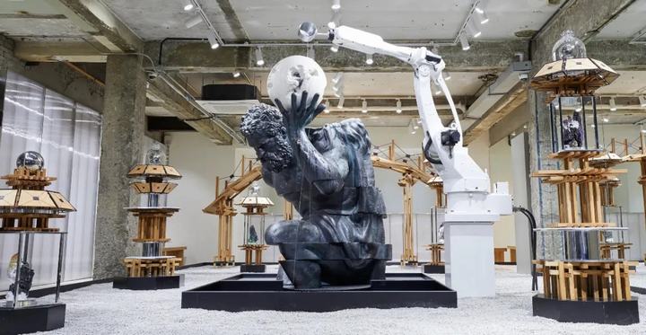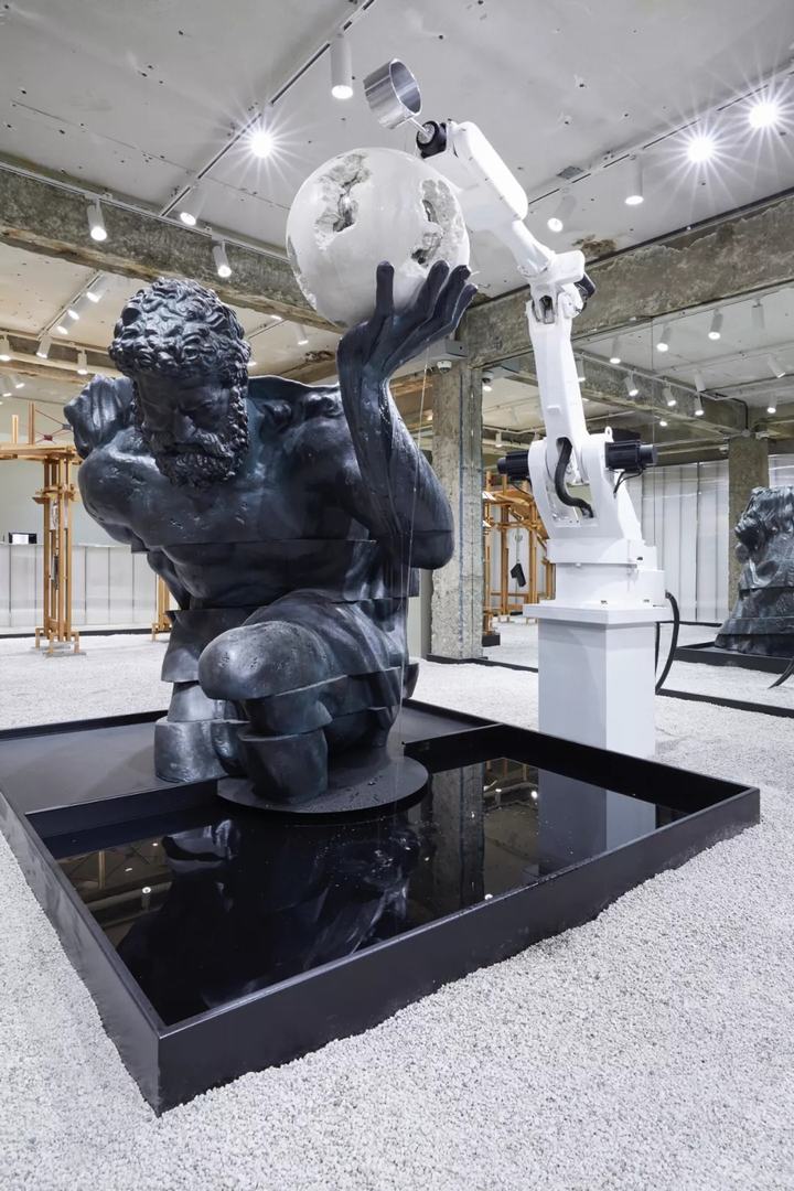 在一楼看到的是阿特拉斯(Atlas)雕像,它坐落在一个鹅卵石花园中,周围是错综复杂的分层结构和拱门,所有拱门都是用木头制成的,但是放在他手中的地球仪却受了重创。除了静态以外,一只巨大的机械手臂勤勉地舀起水倒在地球上,仿佛这是一种仪式治疗。