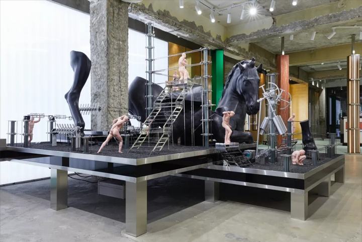 再往上一层,一个不同的背景展开了,通过引入更多的人物来拓展叙事,尽管是小角色,这些人物辛勤地聚集在一起——或者是分解?一尊马像横跨在两个相连的平台上。同样的,运动也是设置的重要组成部分,这里是摆动重物和旋转卷轴的形式。