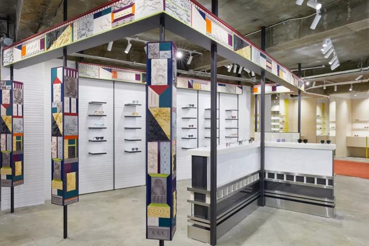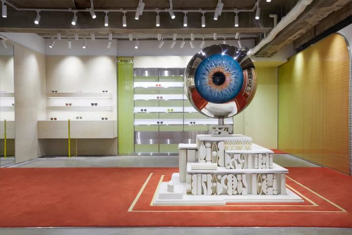 布景的一侧是玻璃嵌板和背光墙,眼镜被放置在光滑的悬挂架上,旁边的设置被金色的瓷砖覆盖,壁挂式架子上有更多的眼镜。在另一边,在一个类似神龛的设置,一个大旋转的眼睛在一个华丽的阶梯式底座上可以找到,并且可以发现右边的货架与更多的商品。它与楼层的另一部分相连,由彩色的马赛克柱子和横梁分隔。