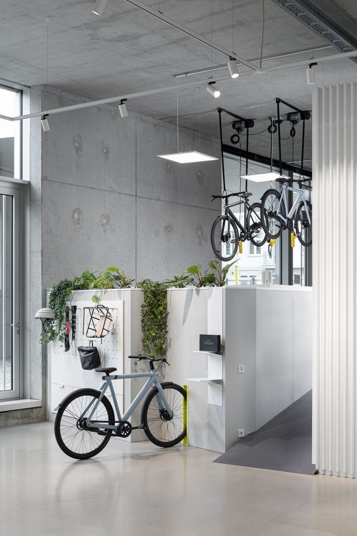 从字面上看,进入的门槛很低,商店感觉就像是他们所在街道的延伸。内部具有功能墙和大量的混凝土和钢材。有其他城市参考的大型图形。座位和花盆类似于街道家具和公园长椅,而自行车维修点区则位于立面后面,就好像它是当地广场上的独立商店一样。至于自行车本身:它们可以自由放置在房间中,因为最终是讲述故事的产品。