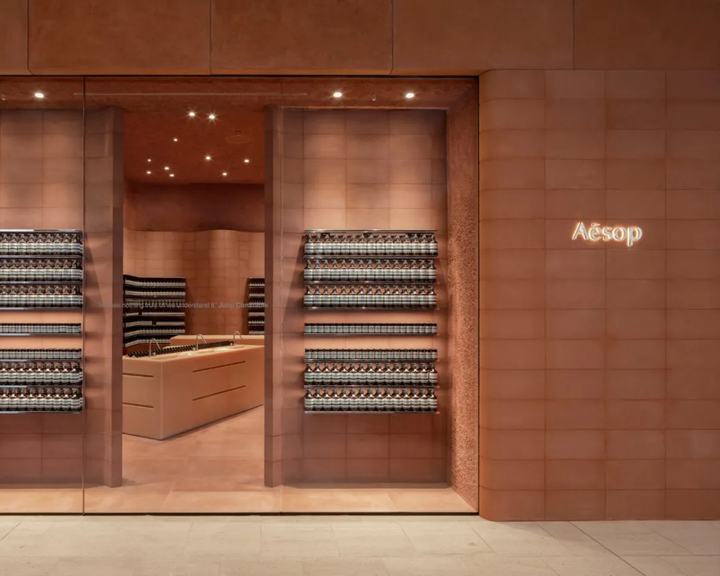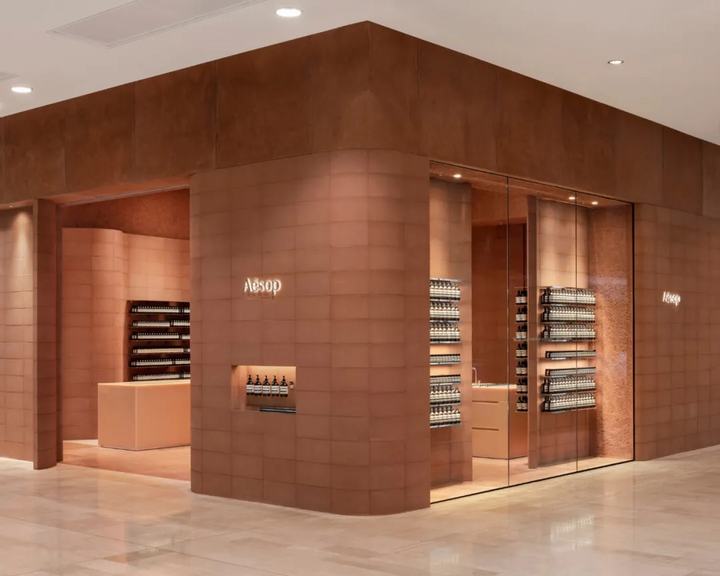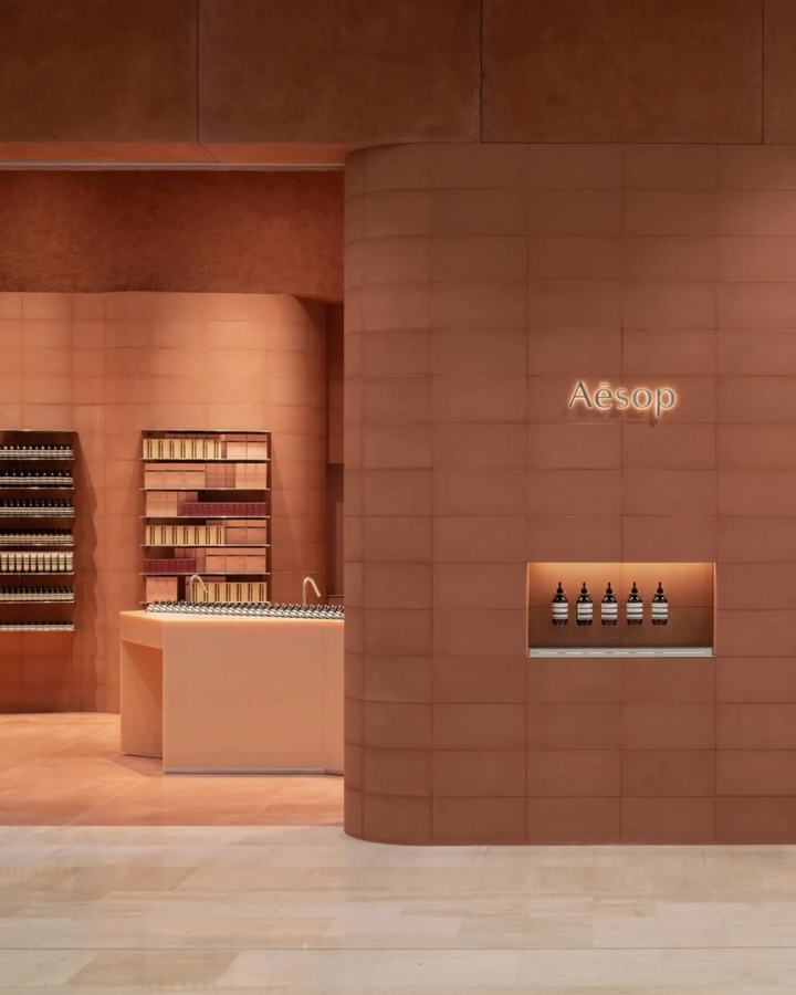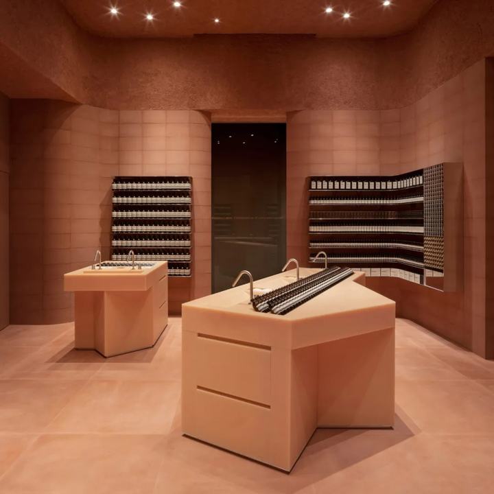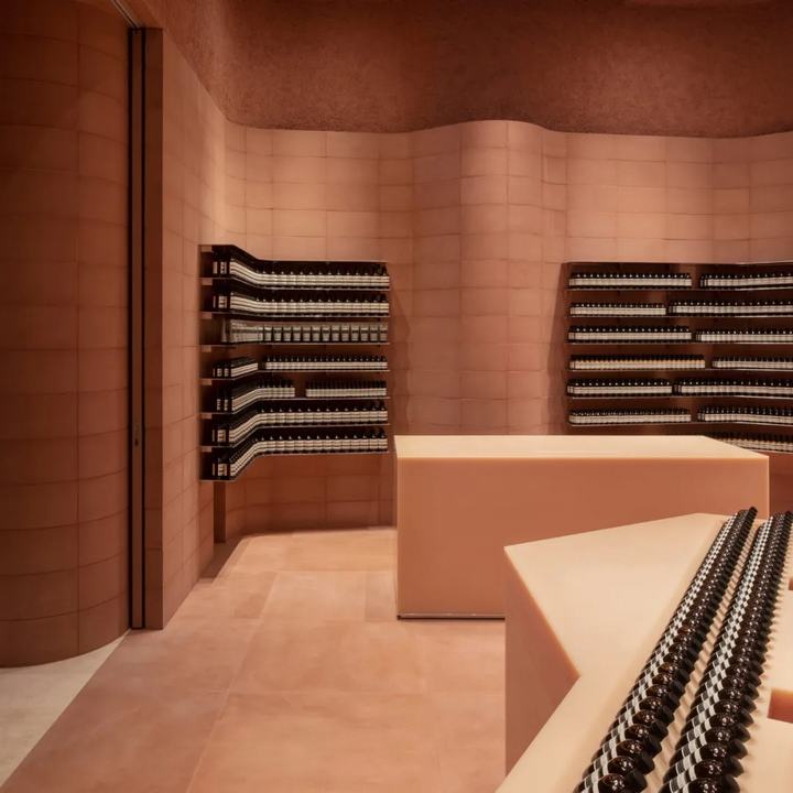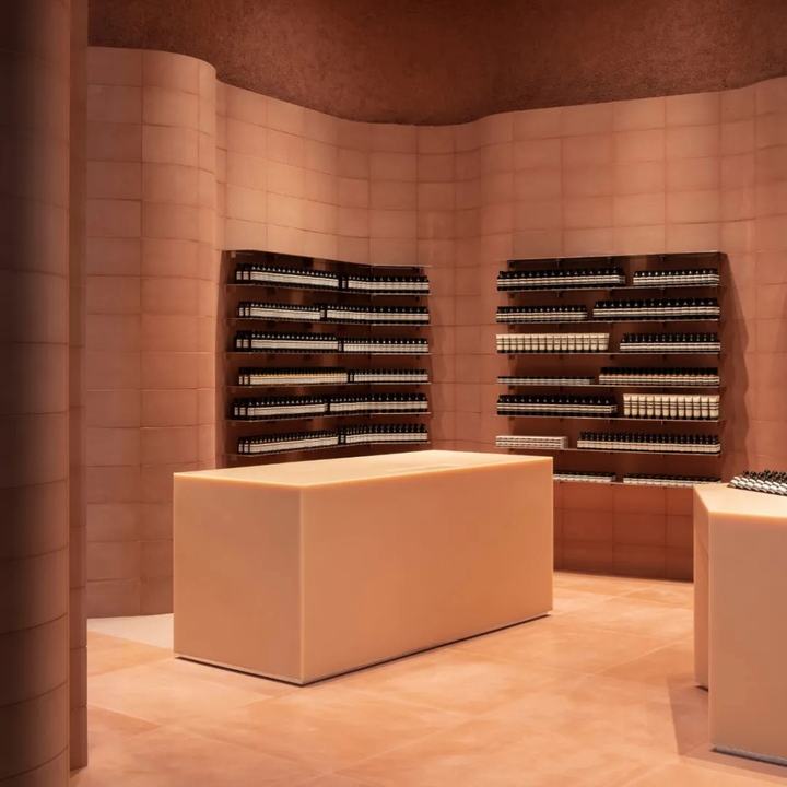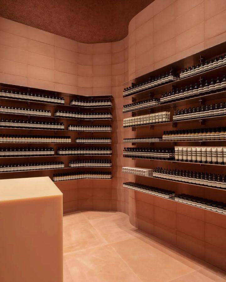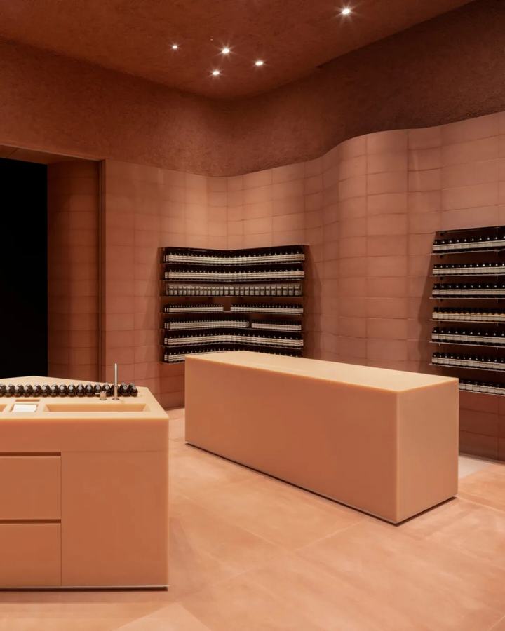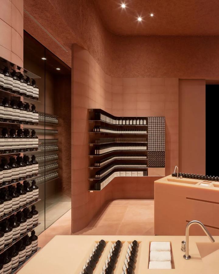 墙体由标准的直和弯曲的terracta彩色混凝土块组合而成。它绕着空间的边缘蜿蜒而行,创造出一种运动感,与它纯粹的物质质量形成对比。在这种冰冻的运动中,精致的抛光铝货架为伊索的标志性产品系列提供了展示空间。
